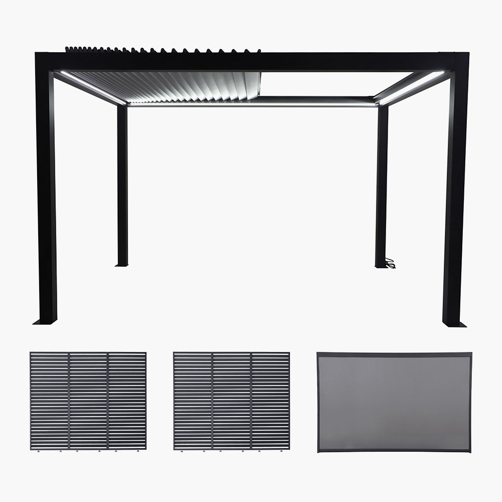 Elevate your outdoor living with our luxurious 3m x 4m Abierto electric pergola. Made from powder-coated aluminium, the solid construction features a waterproof retractable roof, allowing you to extend the outdoor season, for year-round enjoyment. The roof can be retracted or extended with a remote control, or via a mobile app. The electric roof ensures you can bask in the sunshine, or seek shelter from the rain. Our spacious 3m x 4m pergola offers ample space to fully cover an outdoor dining set, or lounge set. The pergola has the added bonus of LED lighting, at the press of a button, the remote-controlled LED's will illuminate your outdoor space with an array of colours, at your chosen brightness, allowing you to create the desired ambiance. The Set also includes 2x 3m fixed louvre panels and 1x 4m electric blind. The louvre panels are crafted from powder-coated aluminium in a contemporary matt grey colourway and allow fresh air and light to penetrate the space, whilst offering protection from the elements. The electric blind, crafted from a weatherproof fabric, also in a stylish grey hue offers further protection, and can easily be lowered to give you an enclosed and private space, providing the perfect outdoor area to entertain friends and family whatever the weather.