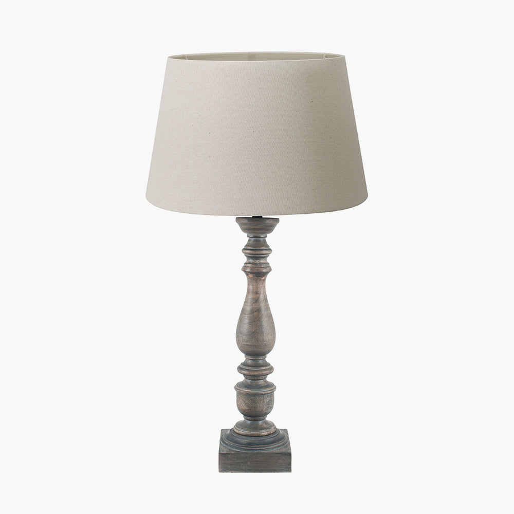 The Alia Grey Wash Turned Mango Wood Table Lamp Base with Coast 45cm Cream Calico Tapered Lampshade blends rustic craftsmanship with soft coastal charm. Handcrafted in India, the turned mango wood base features a subtle grey wash for a refined, versatile finish that complements a wide range of interiors.
