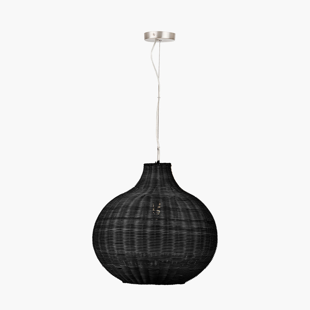 Introducing our stylish, woven rattan ceiling pendant in a sophisticated black hue. Its elegant proportions and delicate curves will make it a statement piece in your interior. Elevate your home with this tasteful and tactile addition.