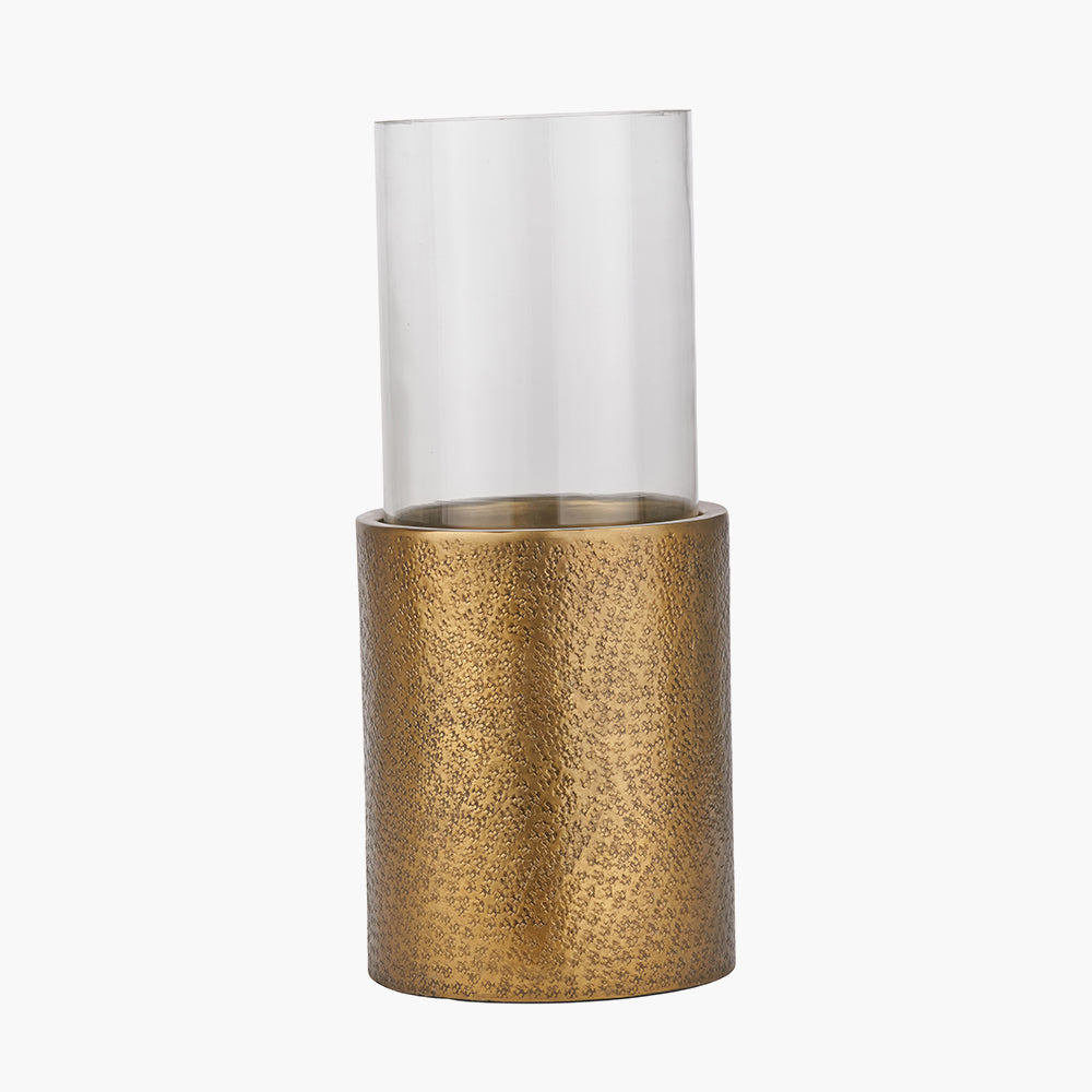 Create a relaxing atmosphere and add a touch of style to your home with our antique brass metal hurricane. Handcrafted in India, the hurricane will look stunning with a large pillar candle enclosed in the sleek, clear glass surround.