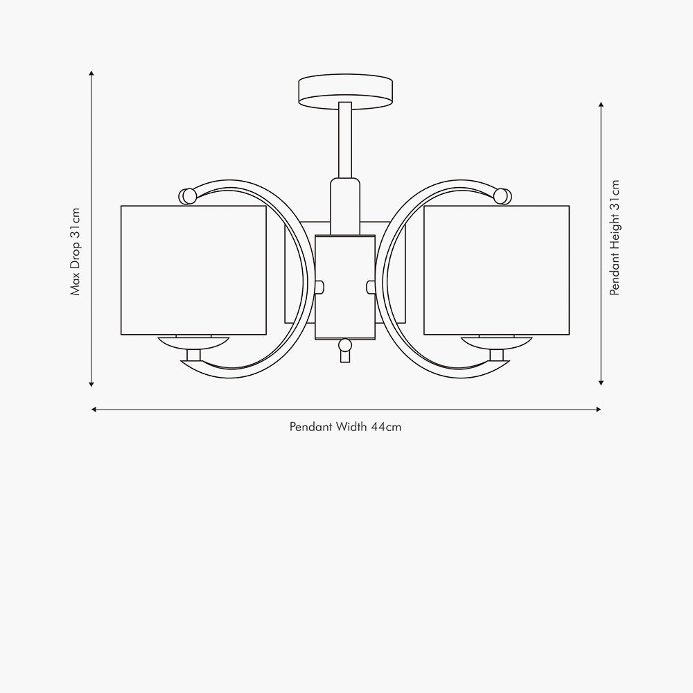 Three grey, faux silk shades sit atop each nickel metal curved arm in this modern chandelier. Minimal, yet bold, this striking piece is an attractive centrepiece in any space. Also available in a 5 arm pendant and a wall light.