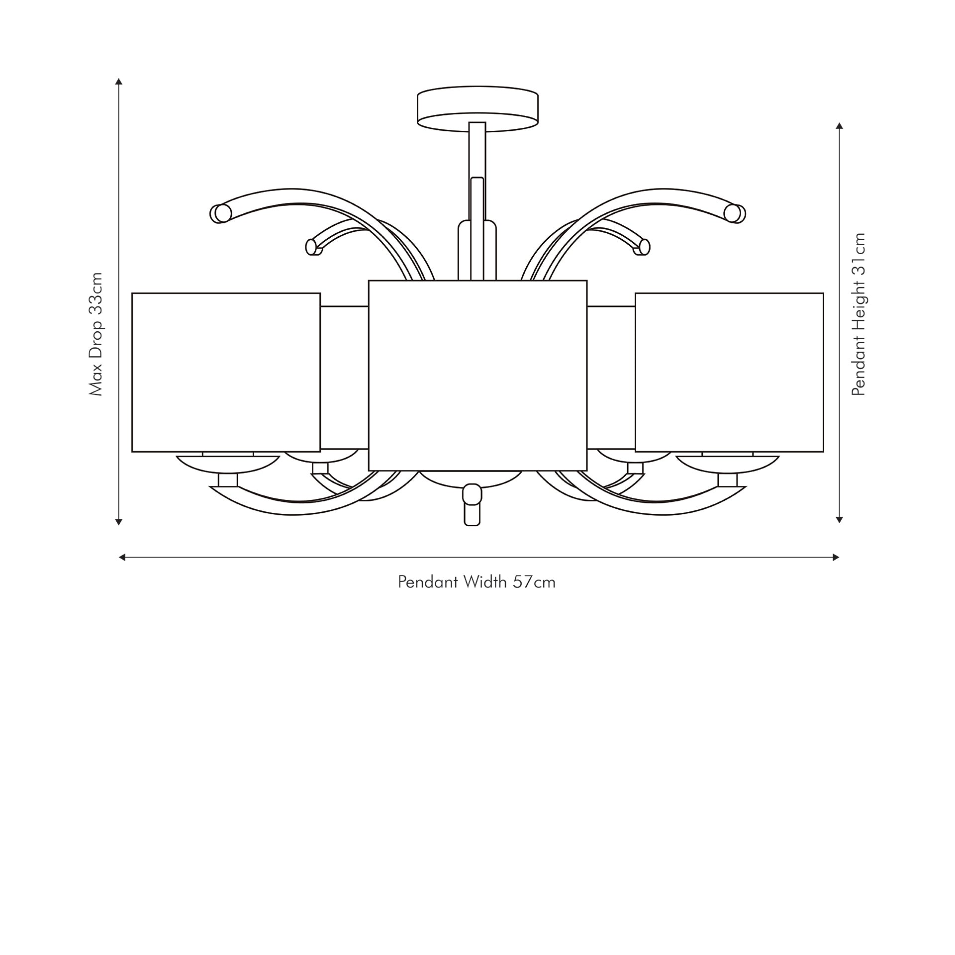 Five grey, faux silk shades sit atop each nickel metal curved arm in this modern chandelier. Minimal, yet bold, this striking piece is an attractive centrepiece in any space. Also available in a 3 arm pendant and a wall light.