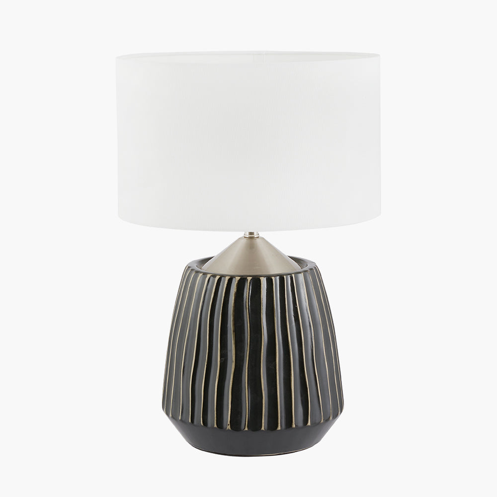 A sleek ceramic table lamp with a ridged stripe detail and finished in a subtle grey glaze. The lamp also has a contrasting domed top in an brushed silver metal. To complete the look it comes with a self lined white faux cotton cylinder shade. Also available in a taller size.