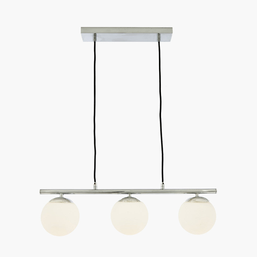 Transform your living areas into a stylish haven with the Asterope 3 White Orb and Shiny Chrome Metal Pendant. This contemporary lighting fixture is expertly designed to enhance the ambiance of any room, making it a perfect addition over kitchen islands or dining tables.