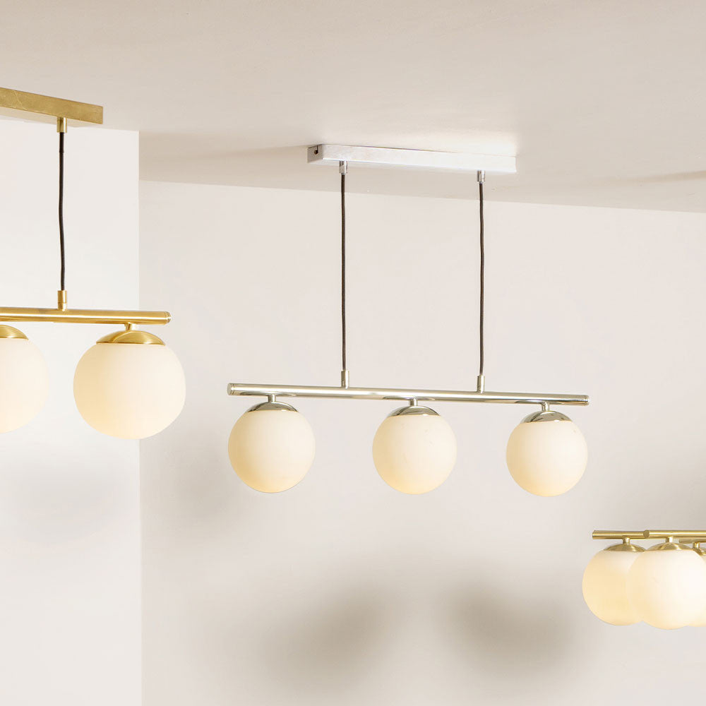 Featuring three elegant white orbs, this pendant light radiates a soft, inviting glow that adds warmth and sophistication to your space. The shiny chrome metal finish not only elevates its modern aesthetic but also ensures durability and longevity.