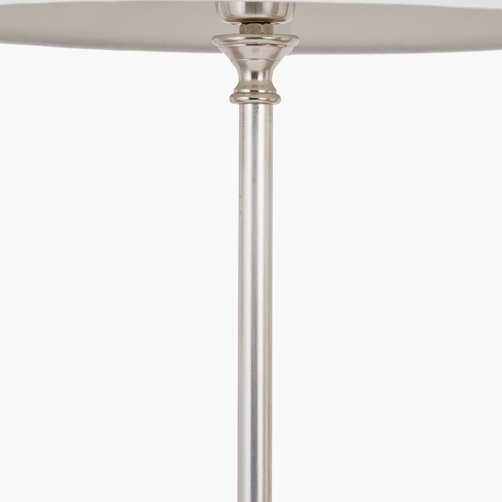 A refined and elegant candlestick floor lamp base made in India, featuring a stepped circular foot and a silver metal finish. Subtle detailing at the top of the stem lends a touch of classic charm. Its graceful proportions make it a perfect choice for living rooms, reading corners, or beside a favourite armchair. We recommend a 35 cm diameter lampshade to complete the look.