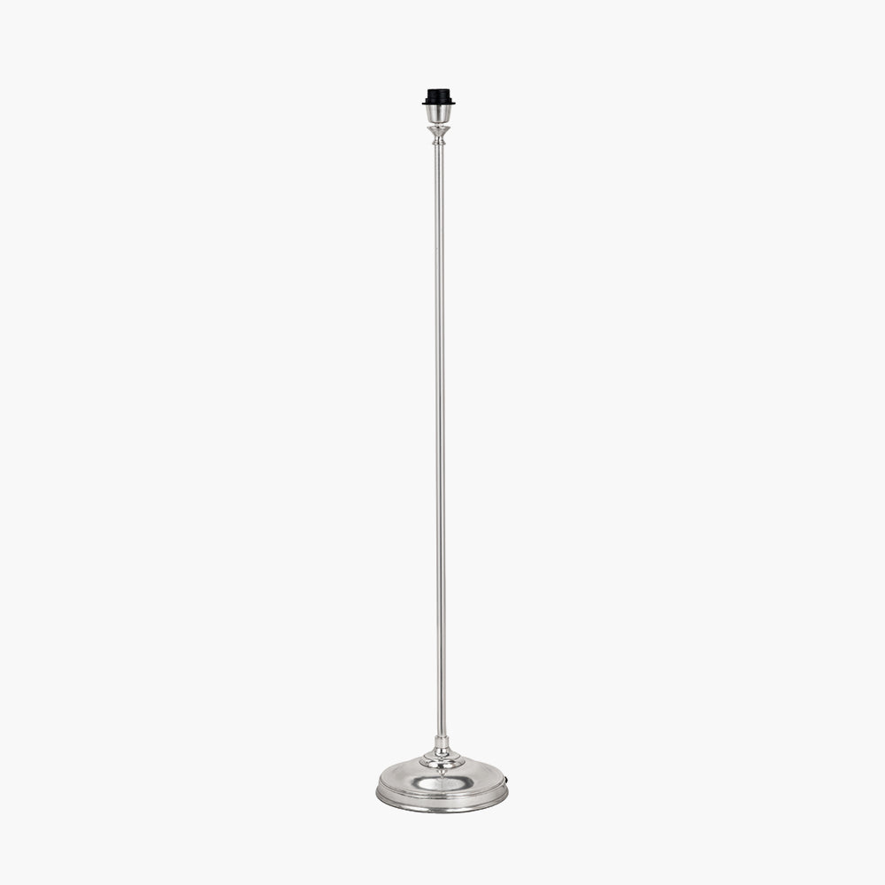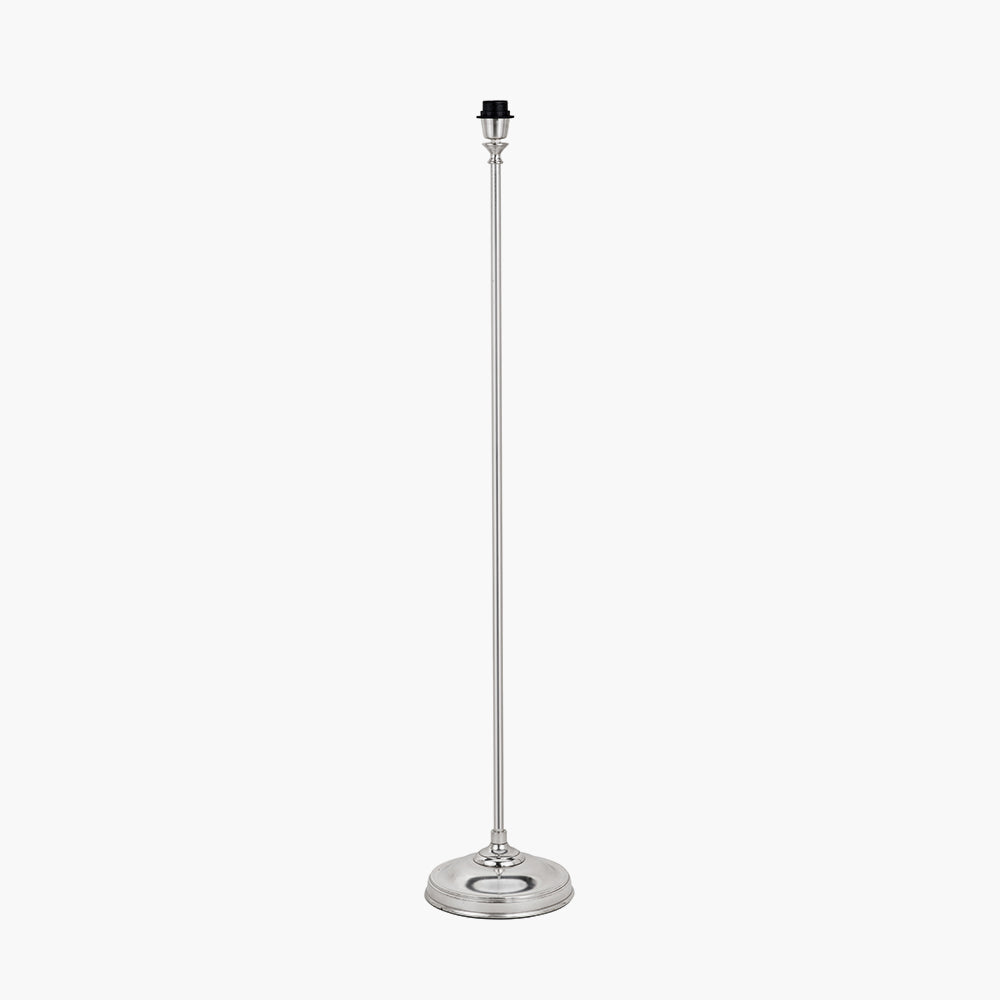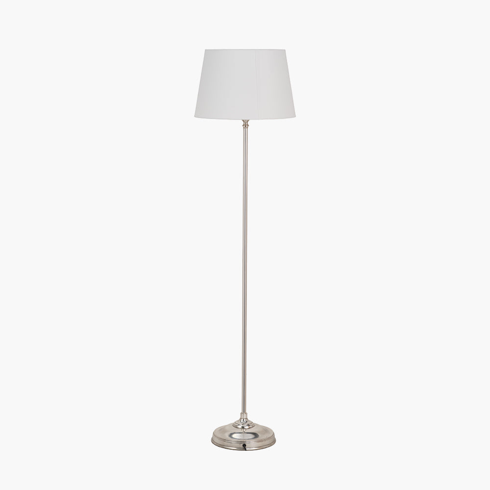 A refined and elegant candlestick floor lamp base made in India, featuring a stepped circular foot and a silver metal finish. Subtle detailing at the top of the stem lends a touch of classic charm. Its graceful proportions make it a perfect choice for living rooms, reading corners, or beside a favourite armchair. Its simple, modern ivory tapered shade completes the look.