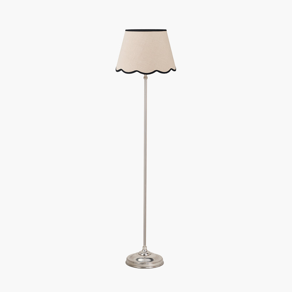 A refined and elegant candlestick floor lamp base made in India, featuring a stepped circular foot and a silver metal finish. Subtle detailing at the top of the stem lends a touch of classic charm. Its graceful proportions make it a perfect choice for living rooms, reading corners, or beside a favourite armchair. Its beautifully crafted cream jute tapered shade with a scalloped edge and contrast black binding creates an elegant silhouette and textured finish that draws the eye��������making it the perfect statement piece.