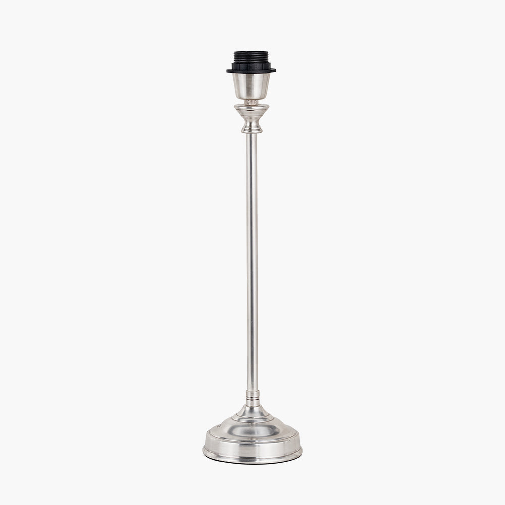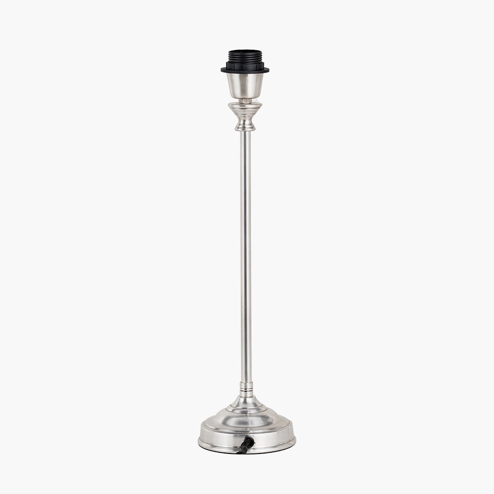 A refined and elegant candlestick table lamp base made in India, featuring a stepped circular foot and a silver metal finish. Subtle detailing at the top of the stem adds a touch of classic charm. Its balanced proportions make it ideal for smaller spaces, sideboards, or console tables. We recommend a 25 cm diameter lampshade to complete the look.