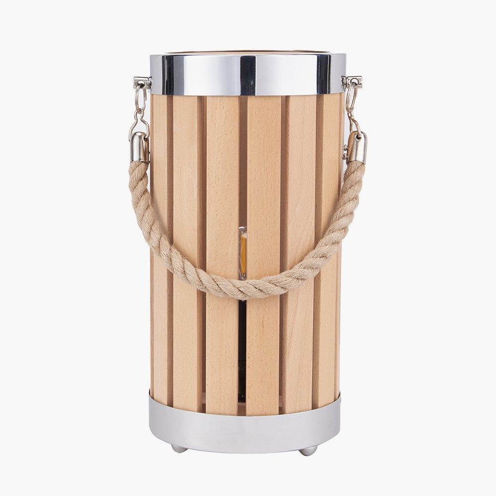 Crafted from natural wood, this compact lamp pairs a contrasting shiny nickel finish with a sturdy natural rope handle, delivering a contemporary twist while maintaining nautical charm.