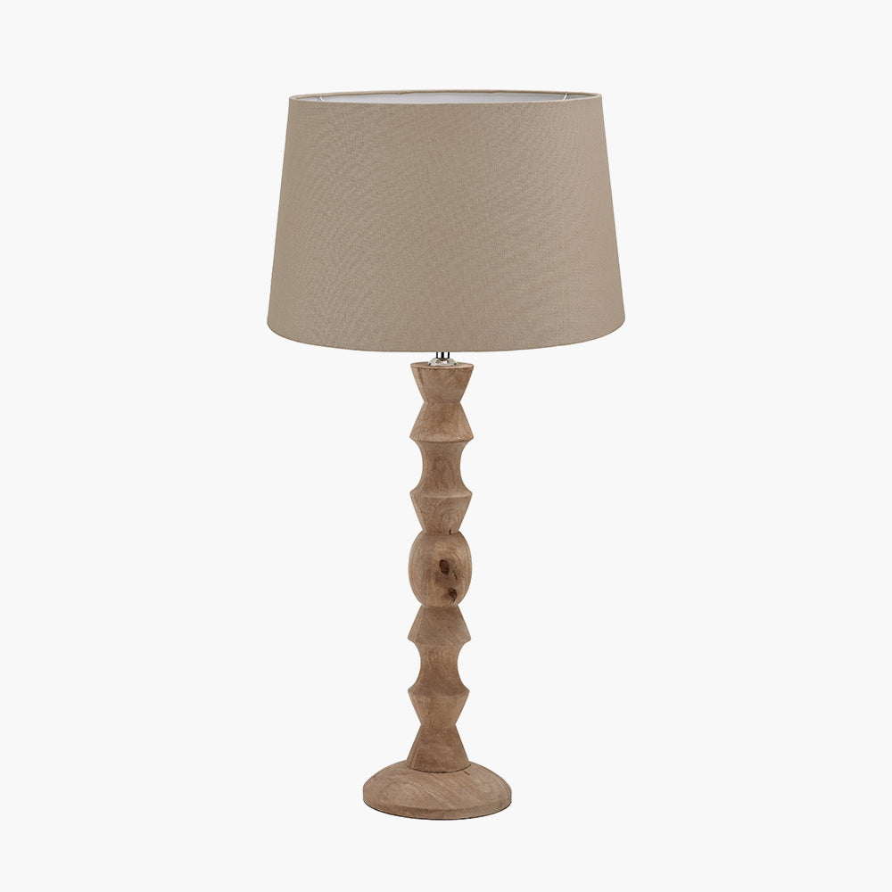 Add a little rustic charm to your room! This lamp is a beautifully handcrafted Indian table lamp made from mango wood and showcases elegant bobbles creating a modern and clean lined look. The lamp is finished in a natural wash which will sit perfectly in any neutral interior. Shaded with an open weave taupe coloured cotton tapered lampshade to complete the look.