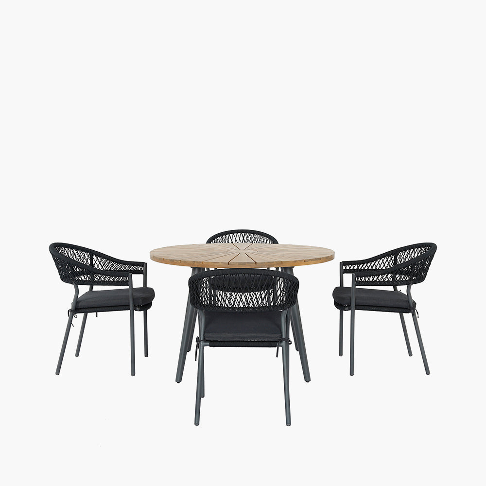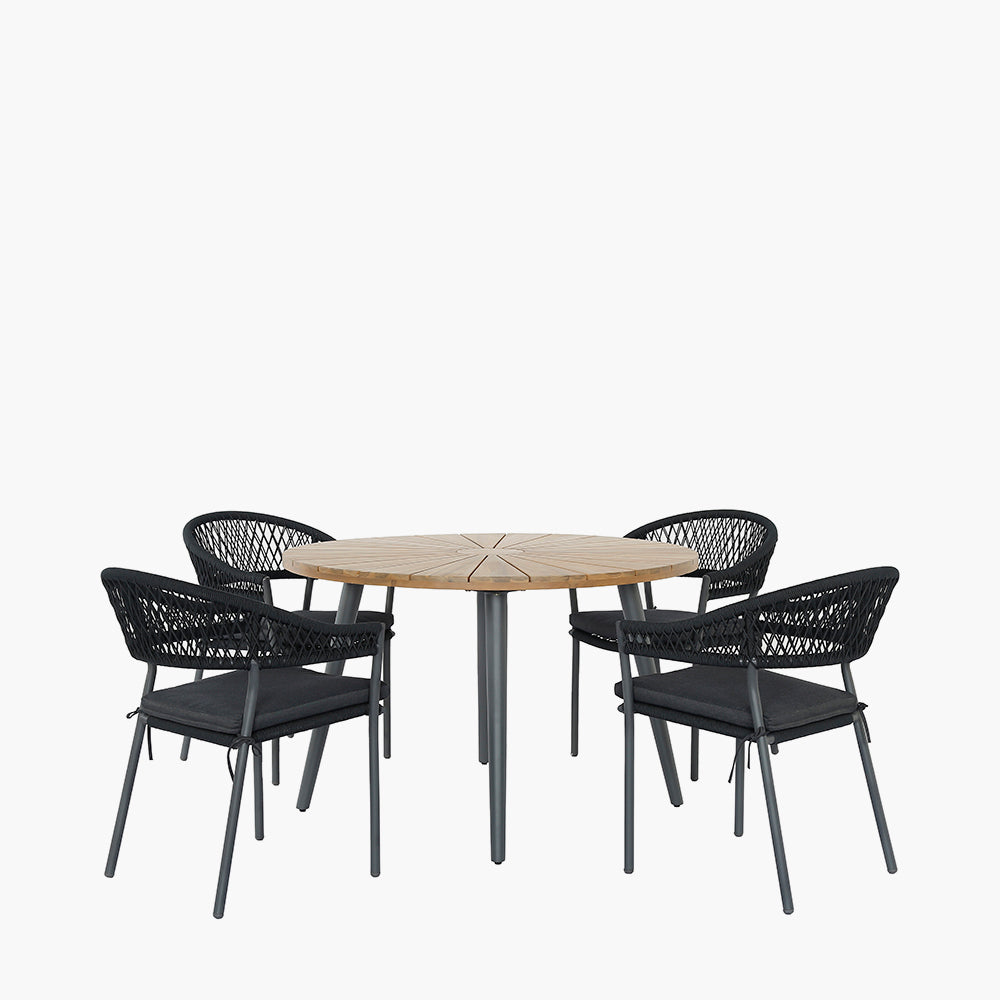 Elevate your outdoor dining experience with the Bazel 4 Seater Outdoor Dining Set. Crafted in Vietnam, the unique star design table top, in light teak effect acacia wood sits perfectly on the sleek black powder-coated metal frame. The stylish chairs, with a black powder-coated metal frame, black rope weave, and black season-proof, fire retardant cushions, ensure comfort and durability. The stackable chairs save space when not in use.
