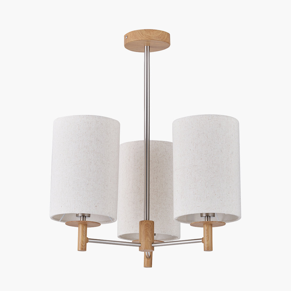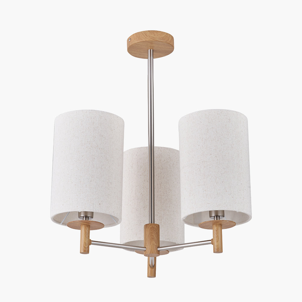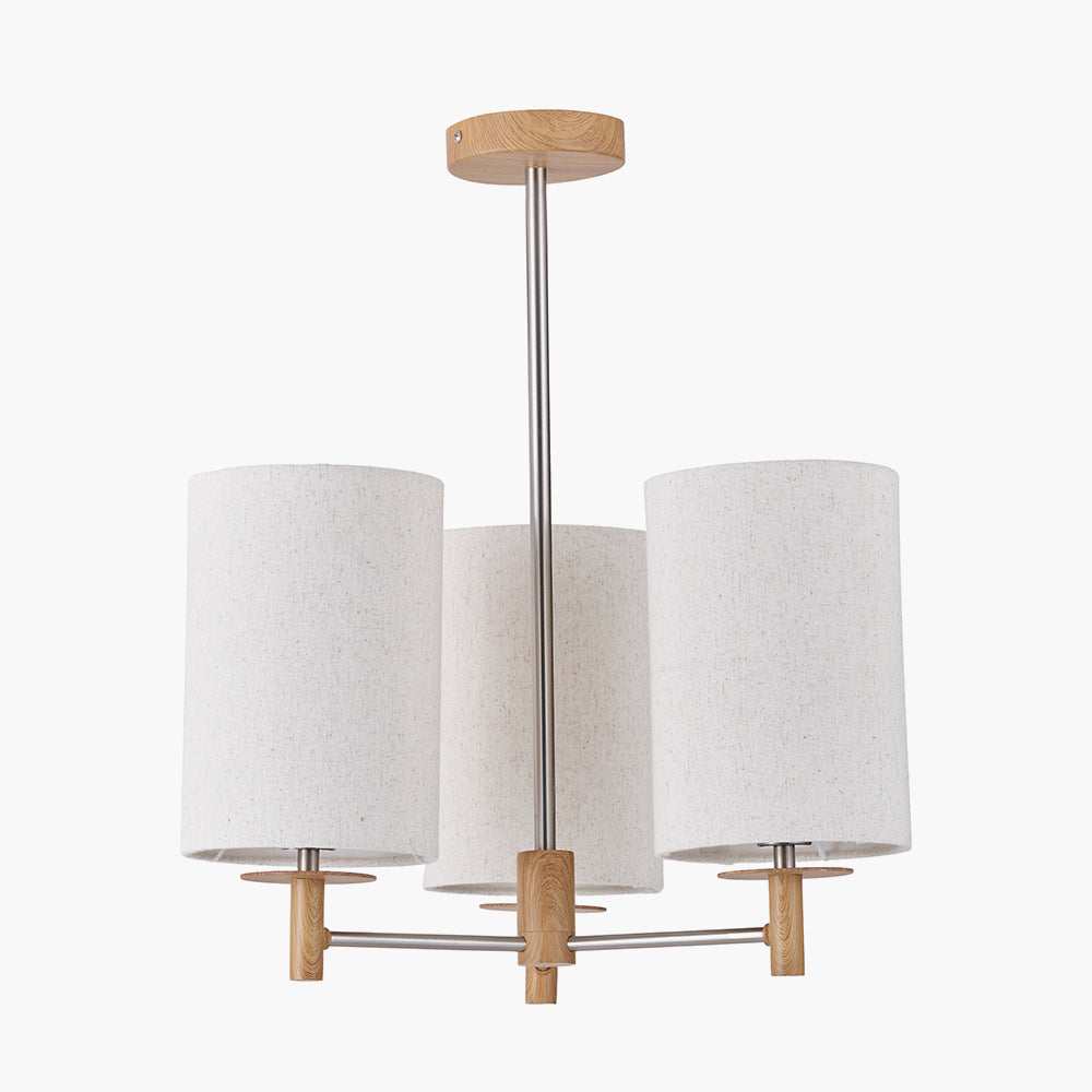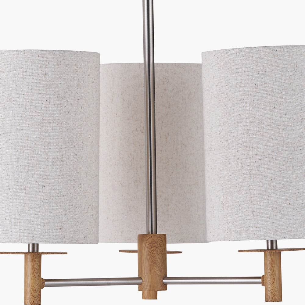 The Bonham Pendant combines clean lines and a modern silhouette to bring a refined, Scandinavian-inspired aesthetic to any interior. Featuring a silver metal stem accented with striking wood veneer details, this ceiling pendant is designed to serve as a focal point in the room. It is finished with three tall white faux cotton shades, completing its contemporary look.