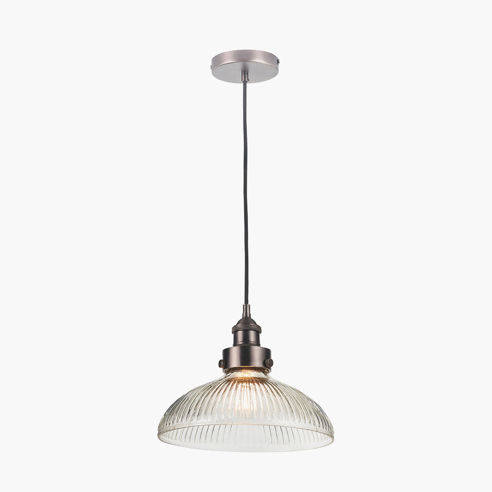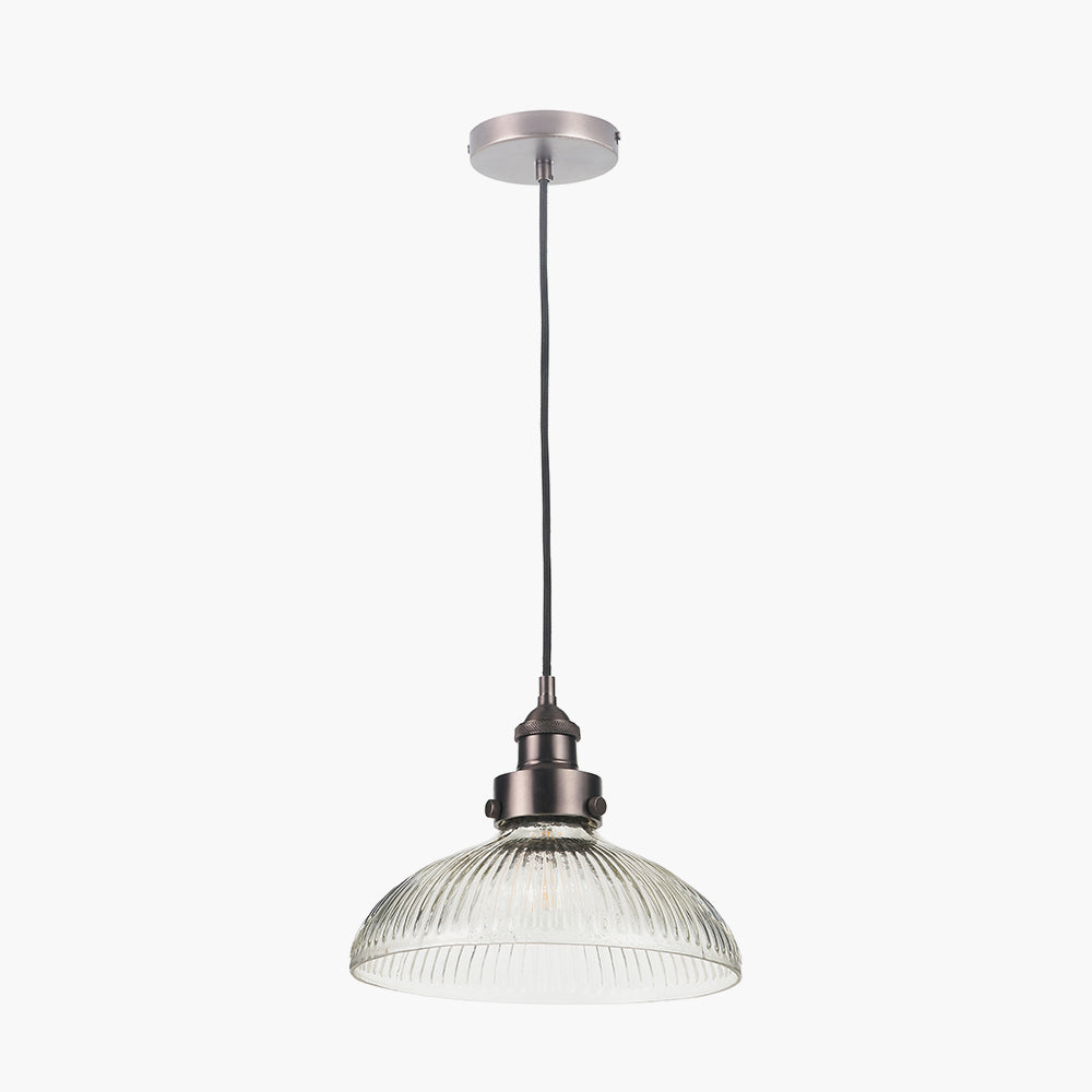 Discover the Bowery Large Ribbed Glass Pendant – a bold blend of contemporary and industrial design, expertly crafted in India. Featuring a striking clear ribbed glass dome and a stylish metal fitting, this pendant light makes a powerful statement in any space. Featuring a striking clear ribbed glass dome and a stylish antique bronze metal fitting, this pendant light makes a powerful statement in any space, add a focal point to your interior with this standout lighting piece.