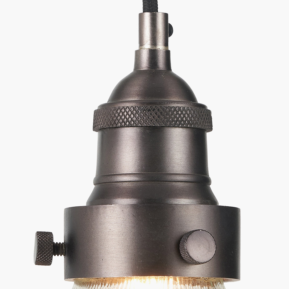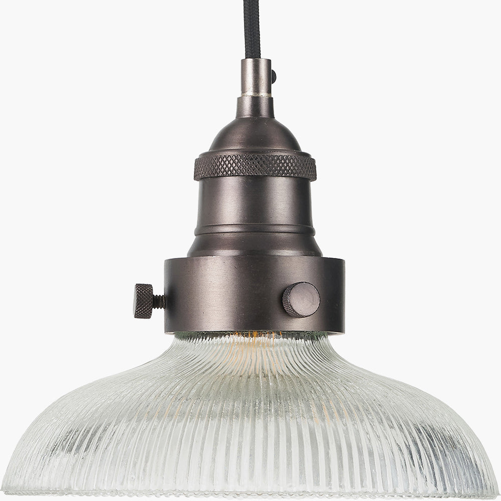 Introducing the Bowery Ribbed Glass Pendant, crafted in India for a contemporary, industrial style. The statement, clear ribbed glass dome, and industrial-style antique bronze metal fitting make a bold focal point in any interior. Elevate your space with this must-have pendant.
