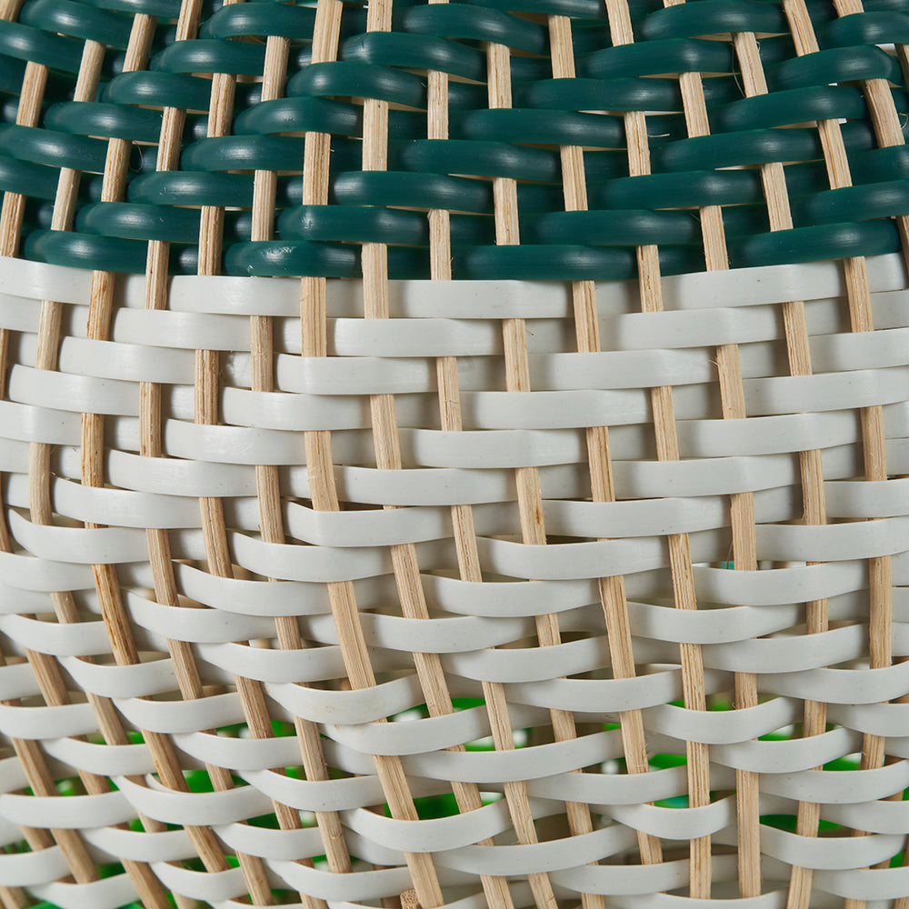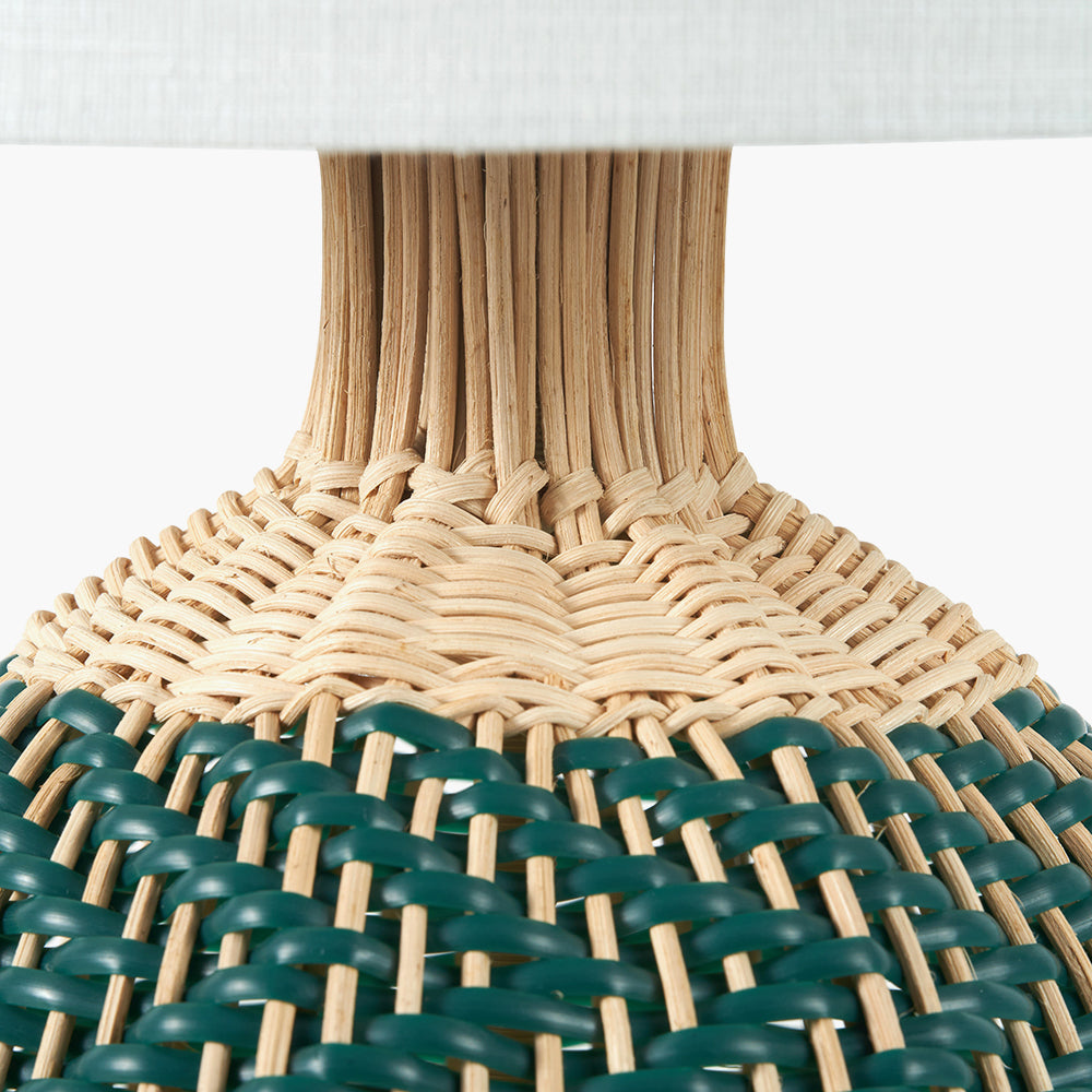Featuring a unique combination of natural and synthetic rattan in vibrant shades of green and crisp white, this lamp serves not just as a light source but as a captivating decorative piece. Its curved silhouette and delicate weave create an organic, tactile touch that enhances any room's ambiance.