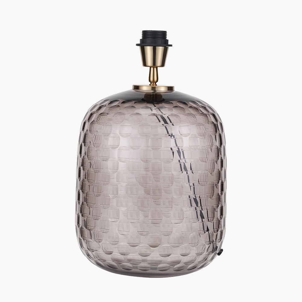 Add a contemporary and elegant touch to your home with our Camille Large Smoke Grey Circle Design Handcut Glass Table Lamp Base. Crafted in India with its intricate hand cut circle design and textured glass, this lamp base will elevate any room. The well-proportioned table lamp base will look fabulous in any room within your home, paired with a simple ivory, cotton mix cylinder lamp shade to complete look.