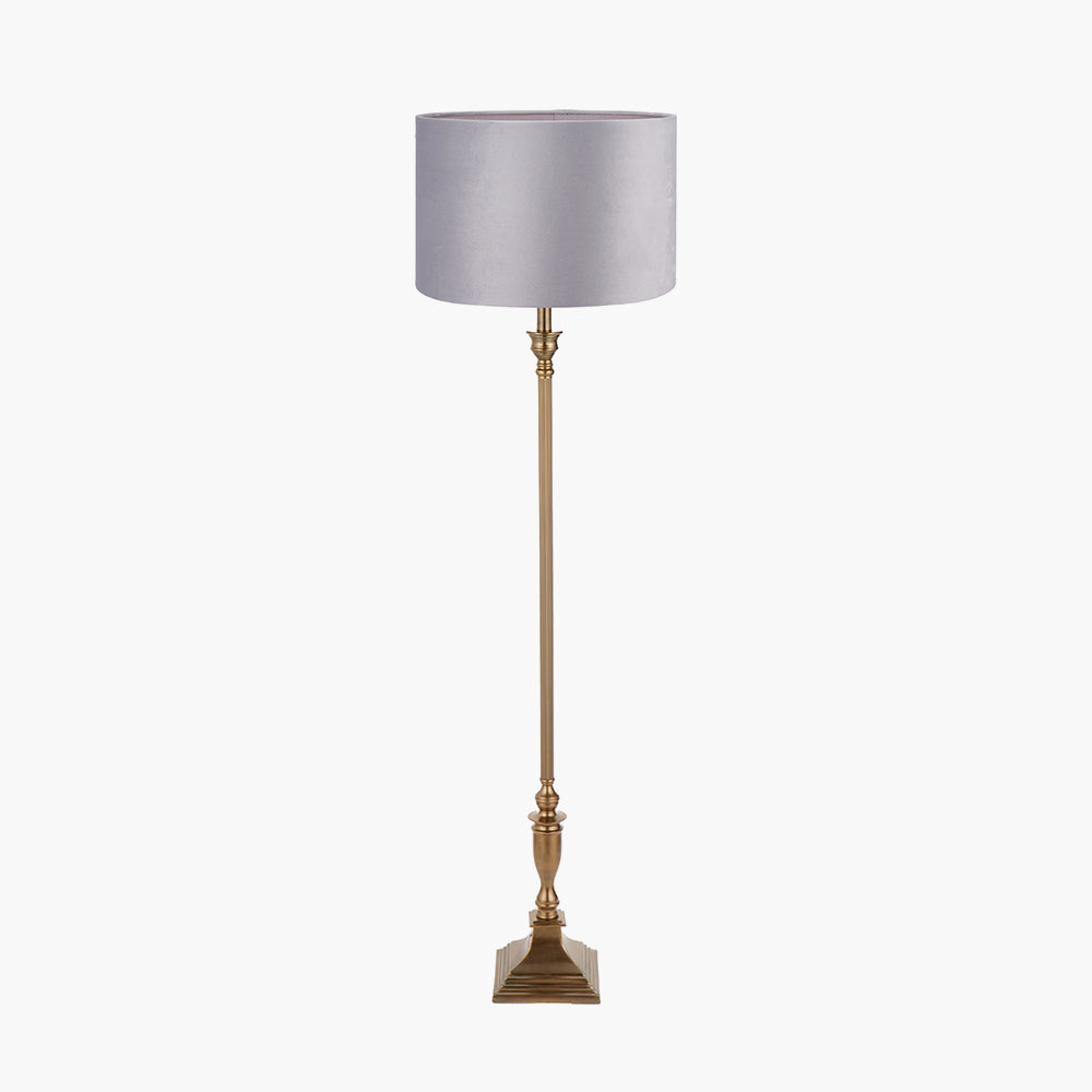 Traditionally styled, this antique brass floor lamp base with ribbed detail on the column, will add a hint of the colonial to your look. Styled with a sumptuous light grey velvet cylinder lamp shade, with a matching coloured lining, this floor lamp oozes style!