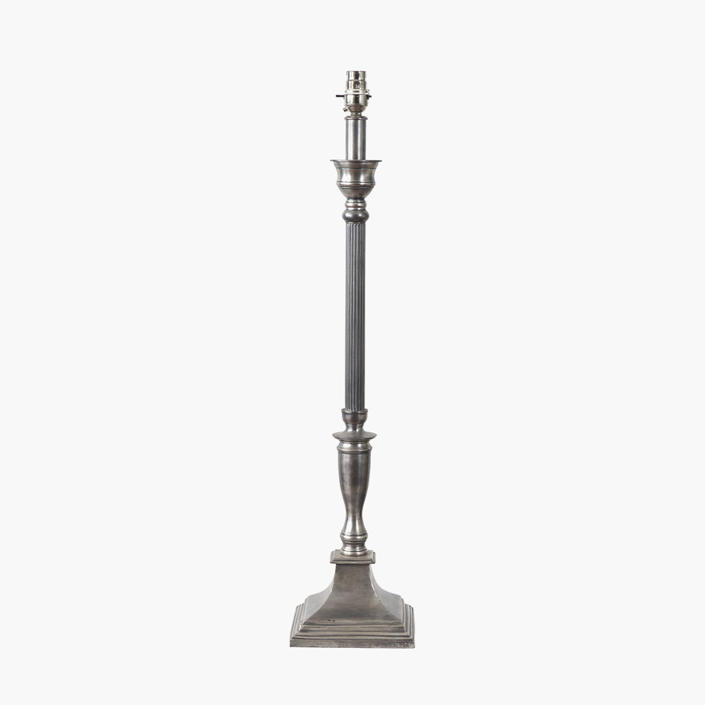 Traditionally styled, this antique silver lamp base with ribbed detail on the column, will add a hint of colonial to your look. Style with either a cylinder or a tapered shade from our range. Also available in a floor lamp Recommended lampshade size: 35cm diameter