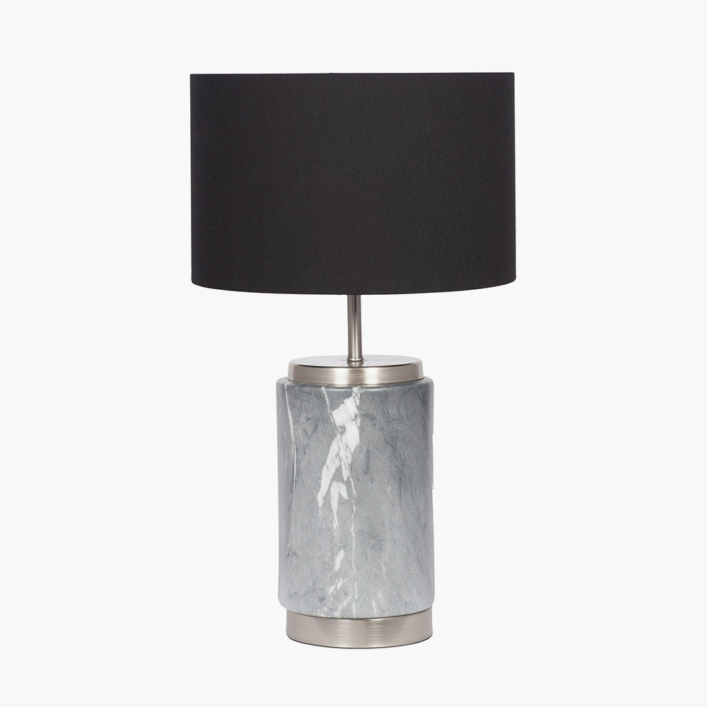 This modern ceramic table lamp with a soft grey marble effect finish is complemented by the brushed silver metal details offering a contemporary look. Topped with a black faux cotton shade this lamp will fit in most décor styles with its beautiful finish.