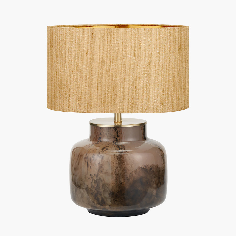 Elevate your interior with our Cerdanya Brown and Beige Glass Table Lamp Base. This hand-blown glass table lamp base, featuring a stylish brown and beige design, topped with a luxurious gold metal plate is most certainly a statement piece. Paired with a gold textured silk mix lampshade with a beautiful gold inner lining to complete the look.