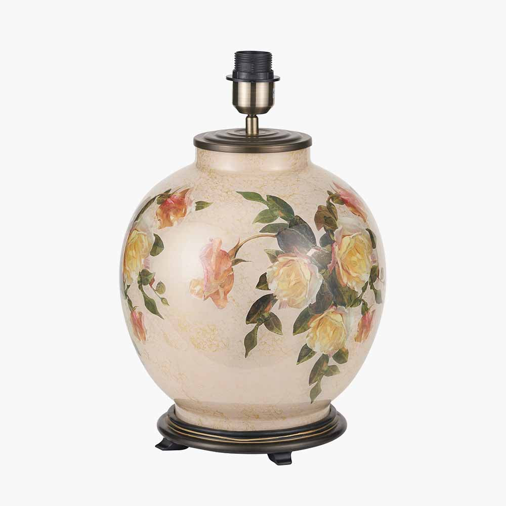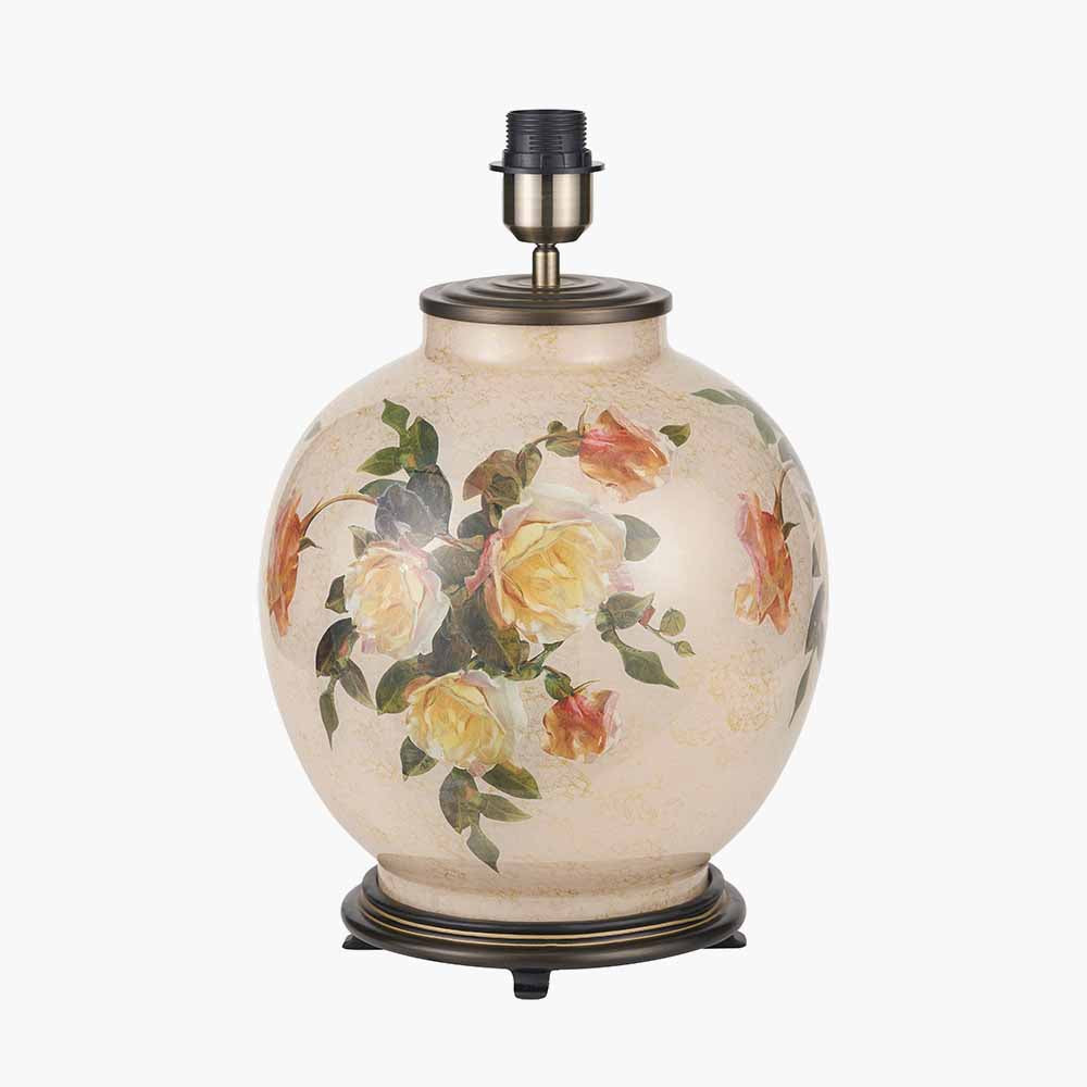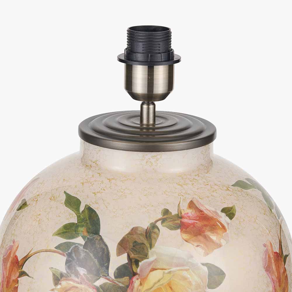 The Classic Rose design is pictured on a cream stone-coloured background using a green, yellow and white palette. The gold accenting gives the design depth and is synonymous with the Jenny Worrall brand. The glass is then completed with an antique brass finish base and top and an E27 light bulb holder in the same finish.