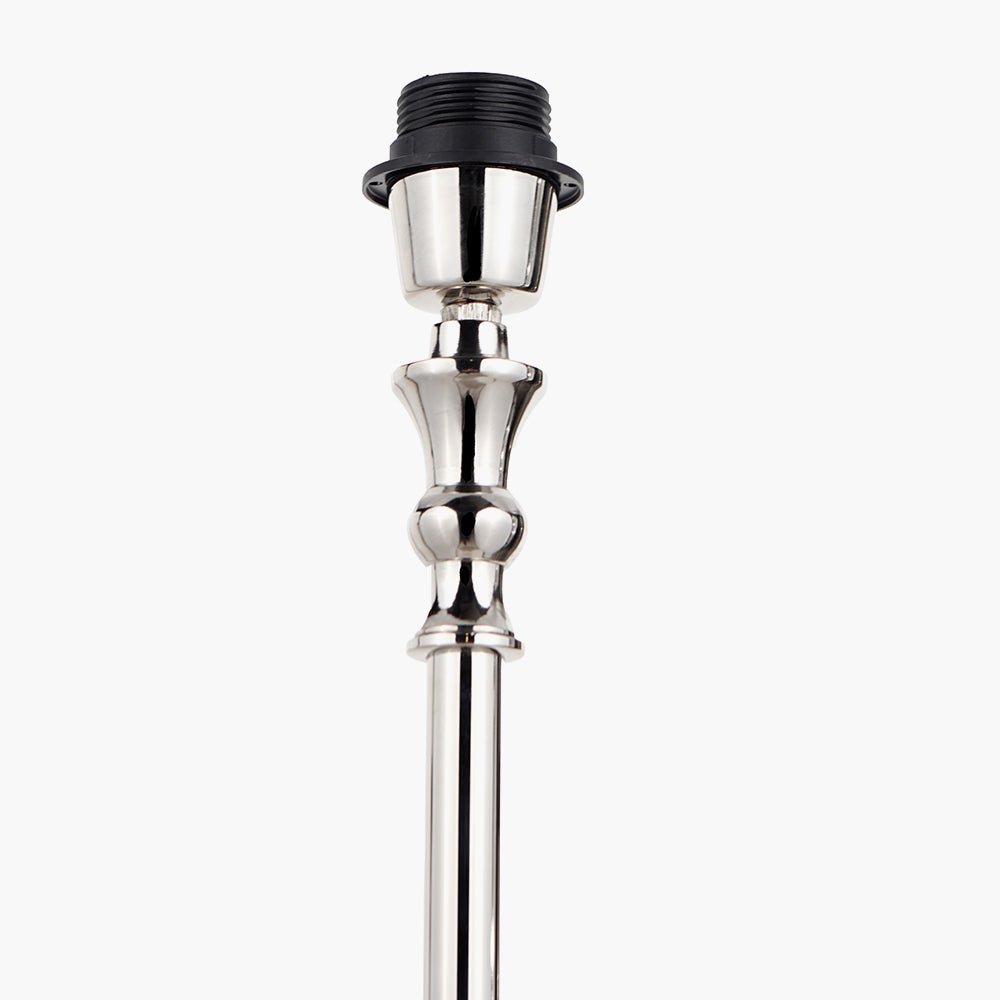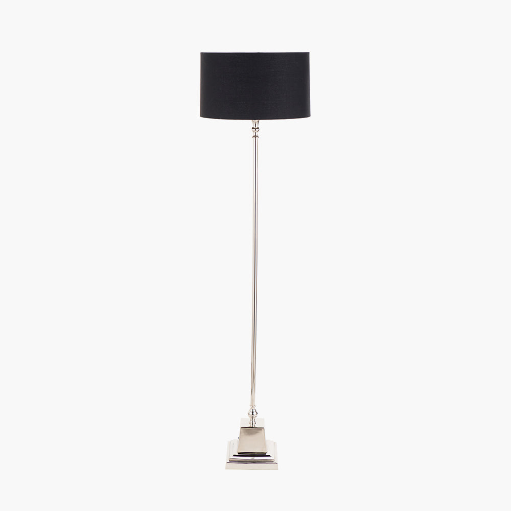 This beautifully simple yet elegant candlestick floor lamp base with a classical square foot is finished in sophisticated shiny silver metal. This base would look fabulous in your living room or dining room to create ambient lighting and is finished off perfectly with a simple, modern black cylinder cotton mix shade.