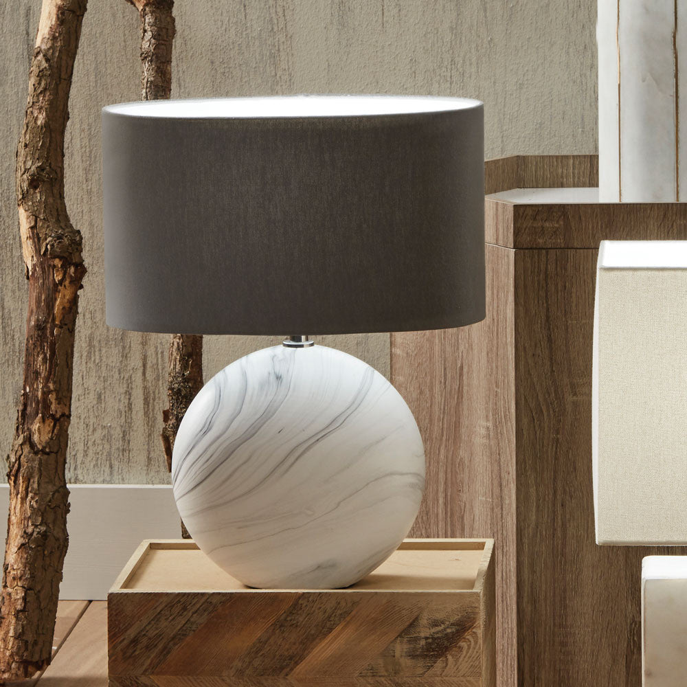 Who would believe this table lamp was ceramic and not marble! A very current marble effect ceramic table lamp, disc-shaped for that perfect console or shelf space crying out for some style! This lamp comes compete with a grey linen effect oval shade to complement it perfectly. Also available in a larger size.
