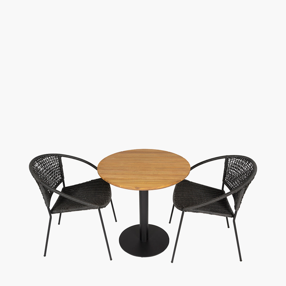 Constructed with a circular table top made of sustainable light teak effect acacia wood, it stands out with its natural beauty and durability. The table is elegantly framed with a black powder-coated aluminium structure, ensuring stability and longevity. Complementing the sophisticated look is the black rope weave, adding a touch of modern elegance.