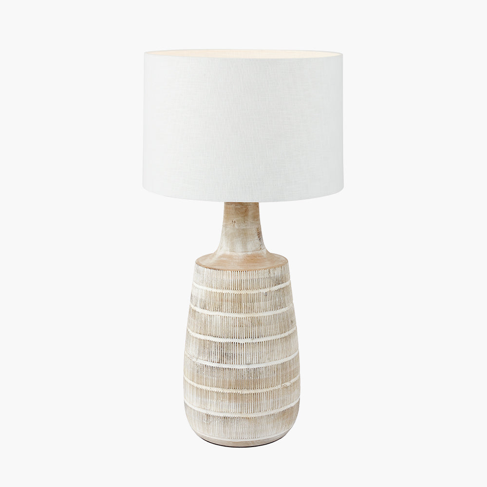 Dambula White Wash Wood Textured Tall Neck Table Lamp Base with Lino 35cm White Self Lined Linen Cylinder Lampshade