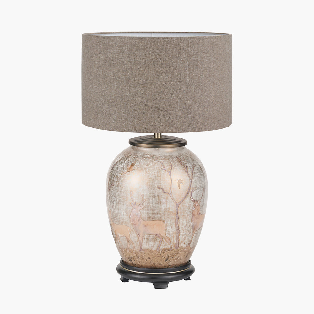 The Deer design is pictured on a cream champagne colour background using a rich brown, cream and grey palette. The gold accenting gives the design depth and is synonymous with the Jenny Worrall brand. The glass table lamp base is then completed with an antique brass finish base and top and light bulb holder in the same finish.