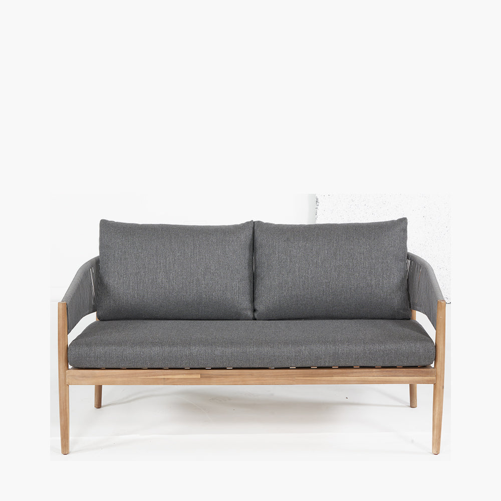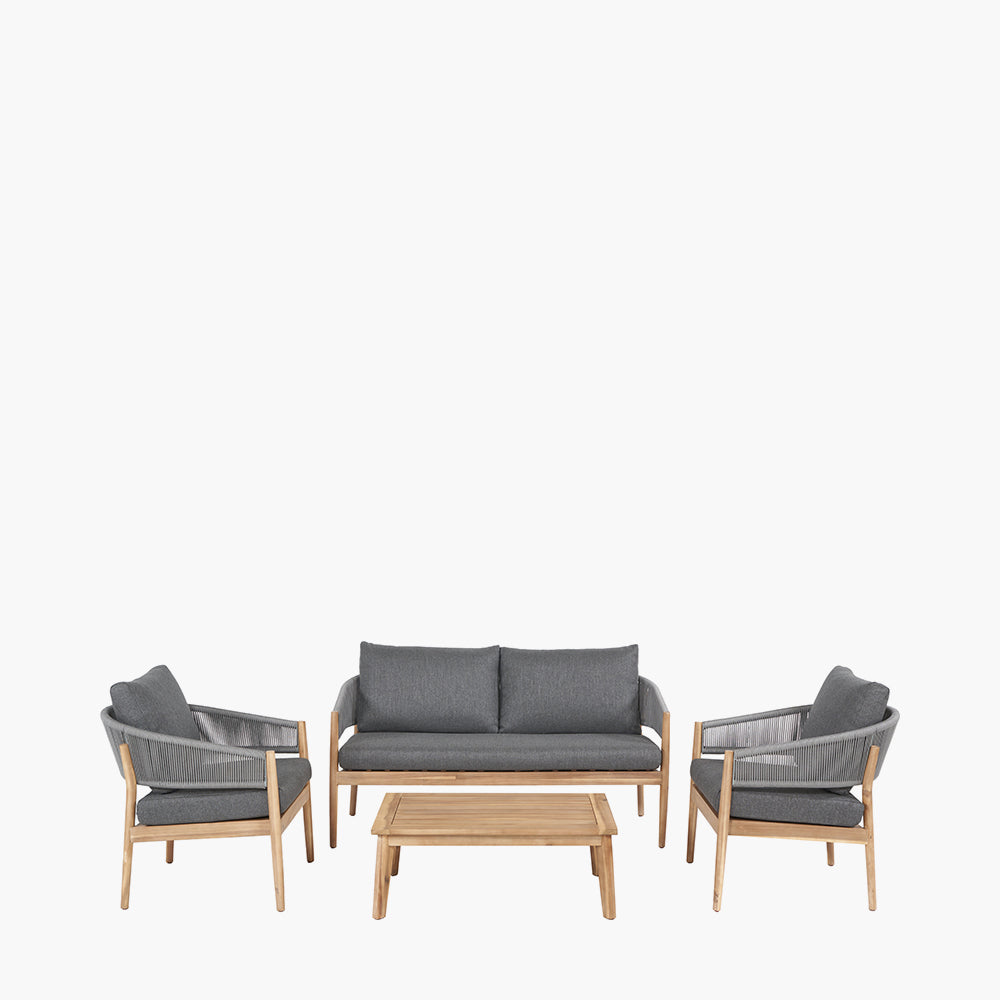 Featuring a beautiful Light Teak Acacia Wood frame complemented by Dark Grey Rope, this versatile seating arrangement includes: