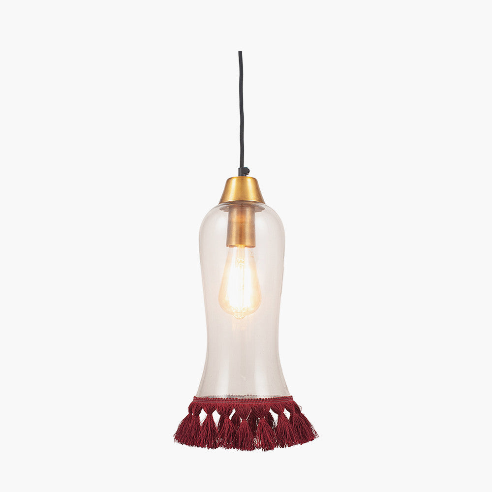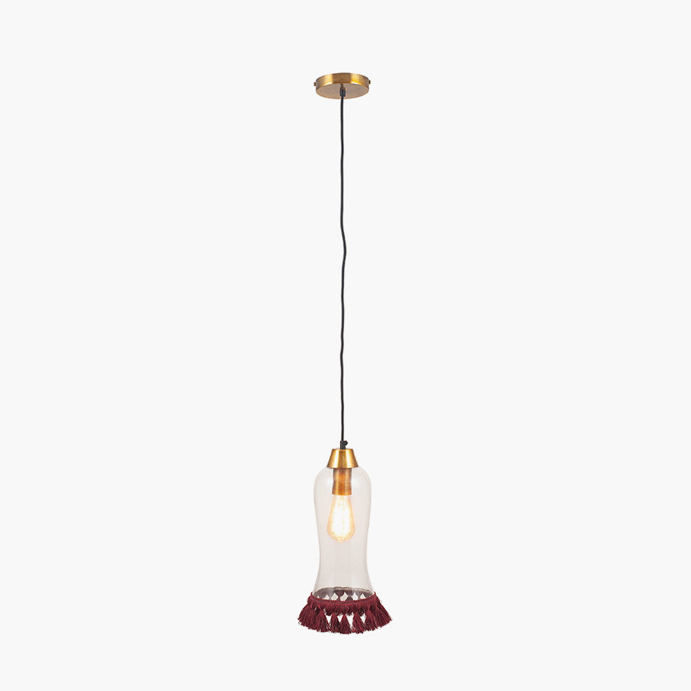 Illuminate your space with the stunning Dita Clear Organic Glass and Red Tassel Pendant, where modern elegance meets playful charm. Handcrafted in India, this vibrant pendant light is designed to be a focal point that enhances any interior décor.