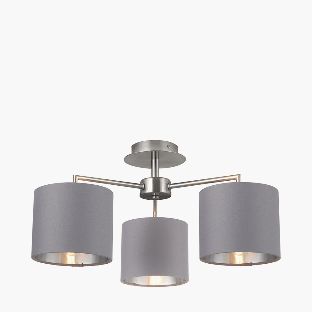 The Elin 3 Light Electrified Pendant is finished in an elegant brushed silver and complemented by 3 faux cotton steel grey shades. The metallic lining allows the light to shimmer when lit. This semi flush pendant is a sophisticated addition to any ceiling.