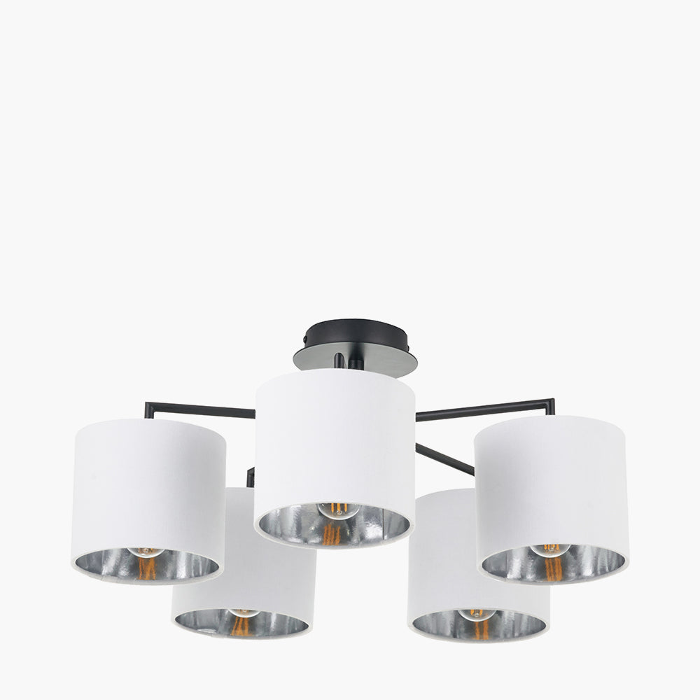 The Elin 5 Light Electrified Pendant is finished in a striking matt black and complemented by 5 cotton effect ivory shades. The metallic lining allows the light to shimmer when lit. This semi flush pendant is a sophisticated addition to any ceiling.