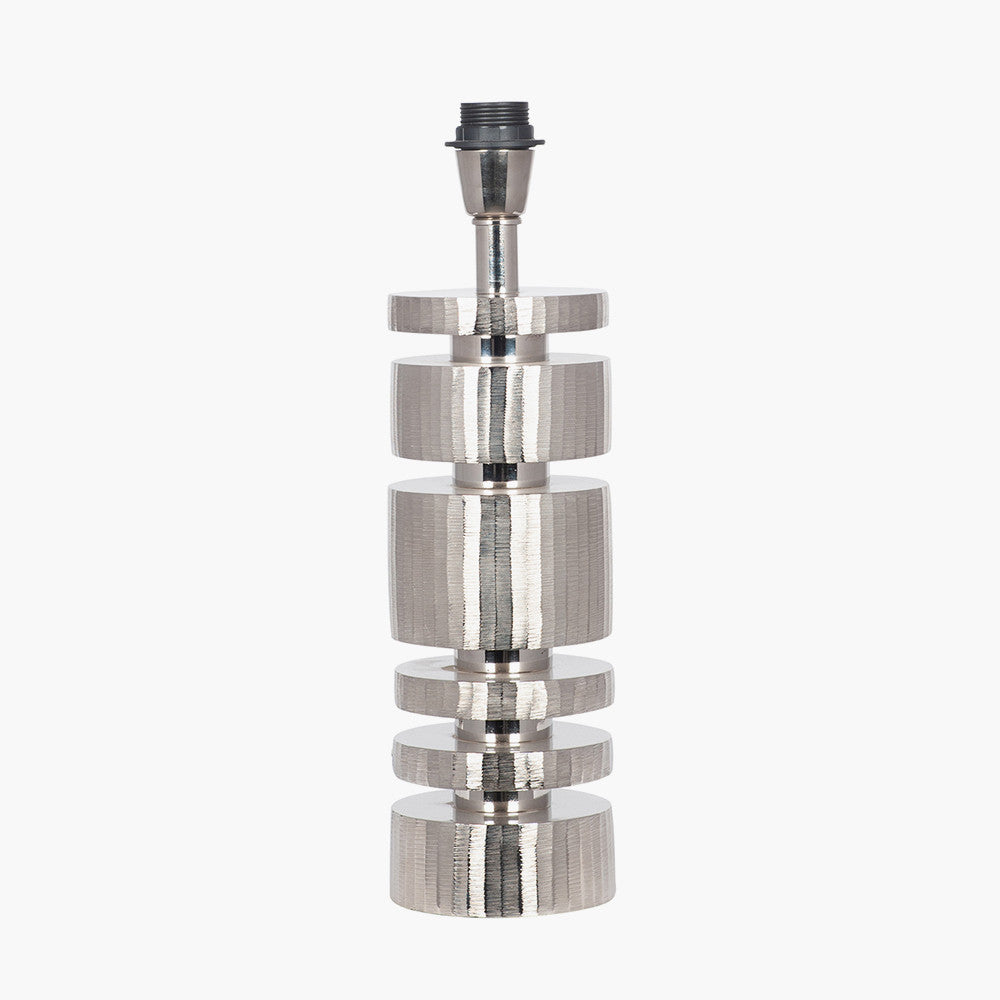 Statuesque and architectural! This lamp base is finished in a soft nickel with delicate linear etching around the metalwork. Top with a neutral linen cylinder for the ultimate impact in any room. Also available in champagne gold. Recommended lampshade size: 35cm diameter