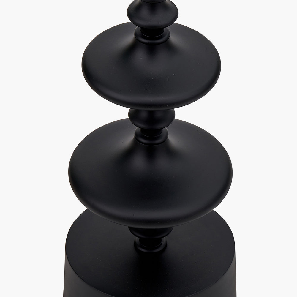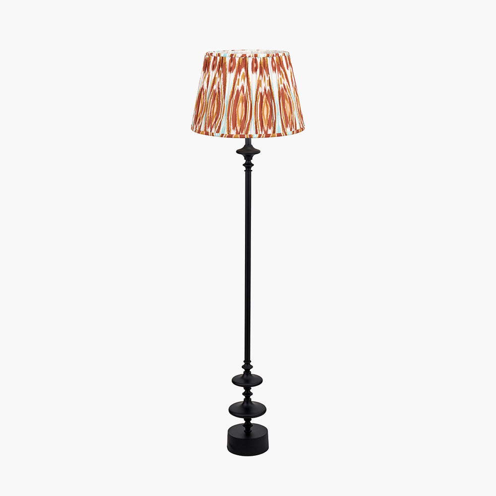 This contemporary candlestick floor lamp base in a matt black finish features a sleek candlestick design, making it a bold addition to any space. Crafted in India, the Emilio floor lamp is topped off with a cotton gathered, tapered lampshade which is adorned with a stunning Ikat pattern in a colour palette of cinnamon and apricot.