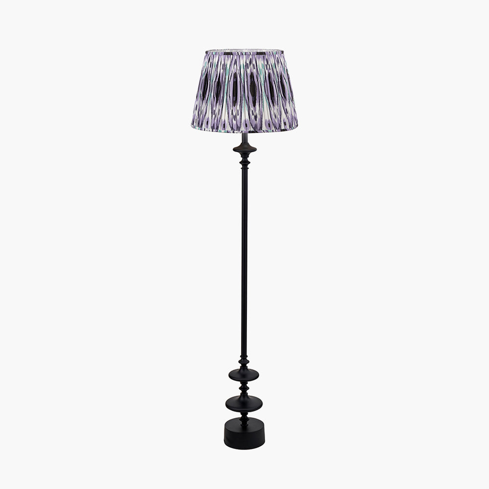 Emilio Matt Black Candlestick Floor Lamp Base with Izara 45cm Lilac Ikat Patterned Mushroom Pleat Tapered Lampshade blends contemporary style with practical lighting. The matte black candlestick base offers a clean, architectural silhouette that anchors a space with timeless appeal. Crafted in India, this lamp showcases thoughtful craftsmanship and durable construction.