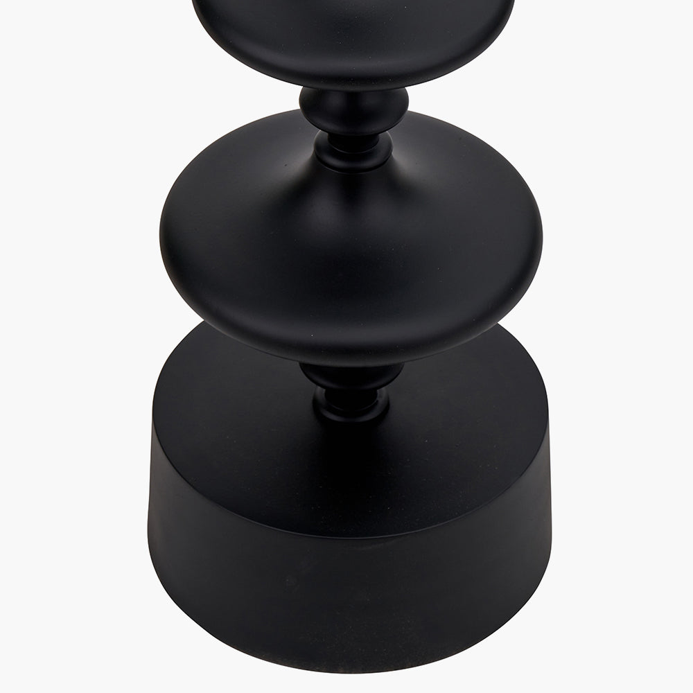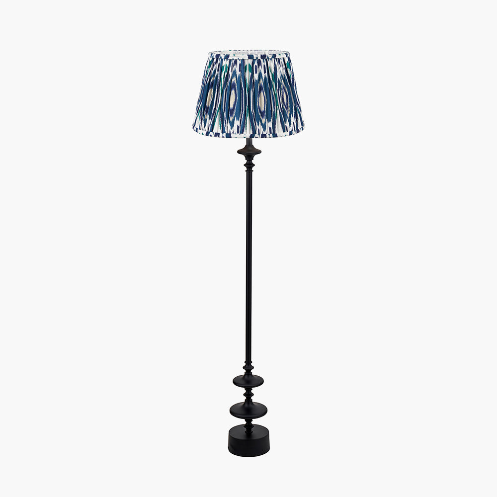 This contemporary candlestick floor lamp base in a matt black finish features a sleek candlestick design, making it a bold addition to any space. Crafted in India, the Emilio floor lamp is topped off with a cotton gathered, tapered lampshade which is adorned with a stunning Ikat pattern in a colour palette of blues and naturals.