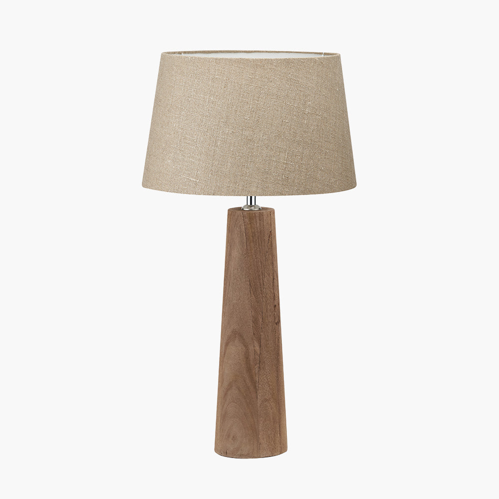 This elegant table lamp boasts a sleek natural finish in a contemporary shape, offering a distinctive and refined design. Its graceful conical-shaped silhouette enhances any living room, and looks fabulous paired with a beautifully rustic, natural, open weave jute linen tapered lampshade.