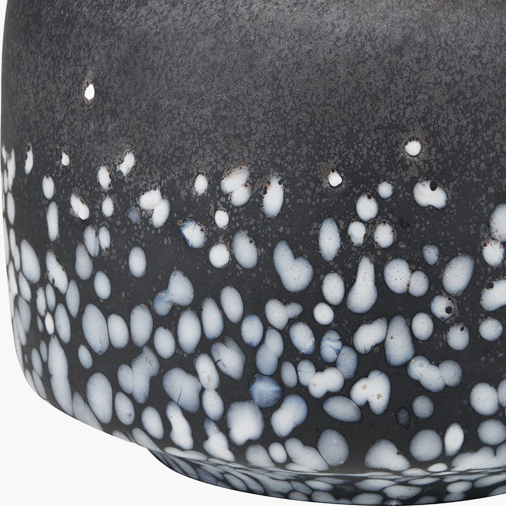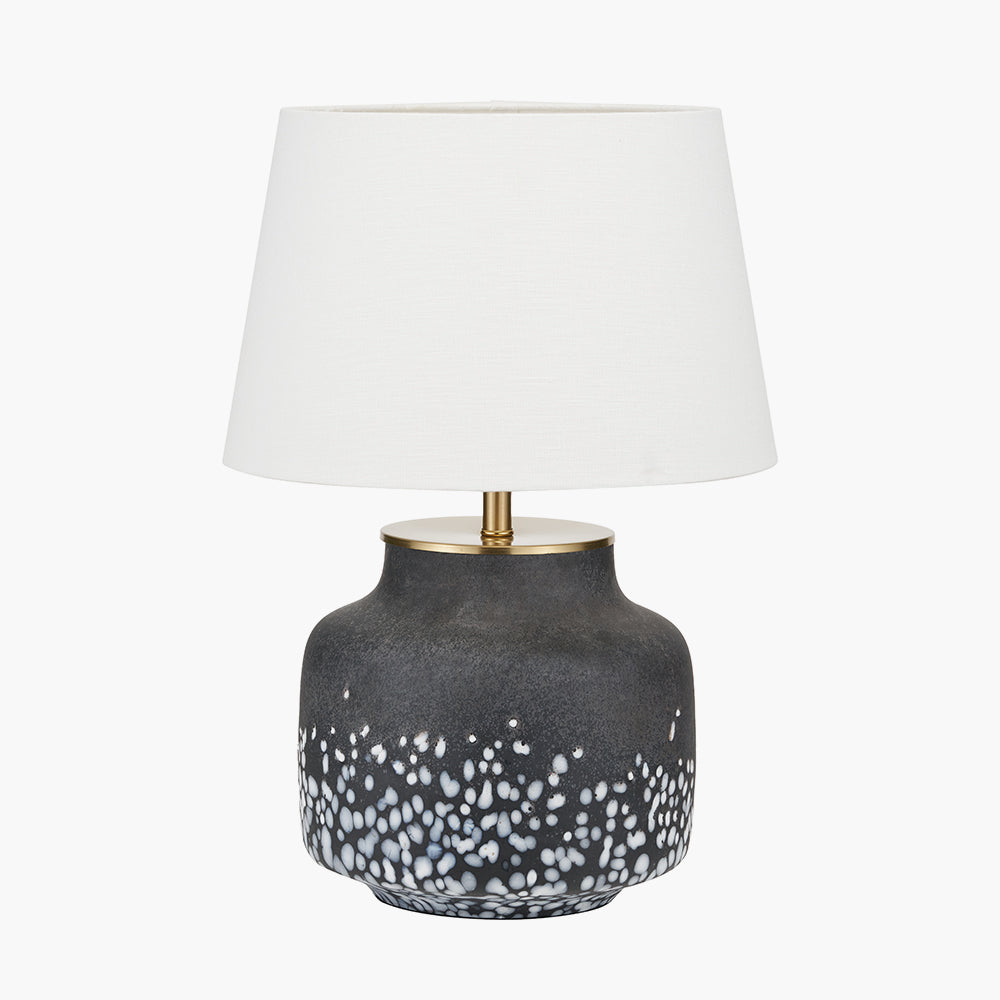 This stunning hand-blown black glass table lamp base, with a white speckled design inherent in the glass, is sure to be a focal point within your interior. The glass table lamp base is topped off with a gold metal plate, enhancing the elegance of the table lamp base, further complemented by the open weave white linen tapered lampshade, allowing the light to filter through, and adding to the monochromatic look.
