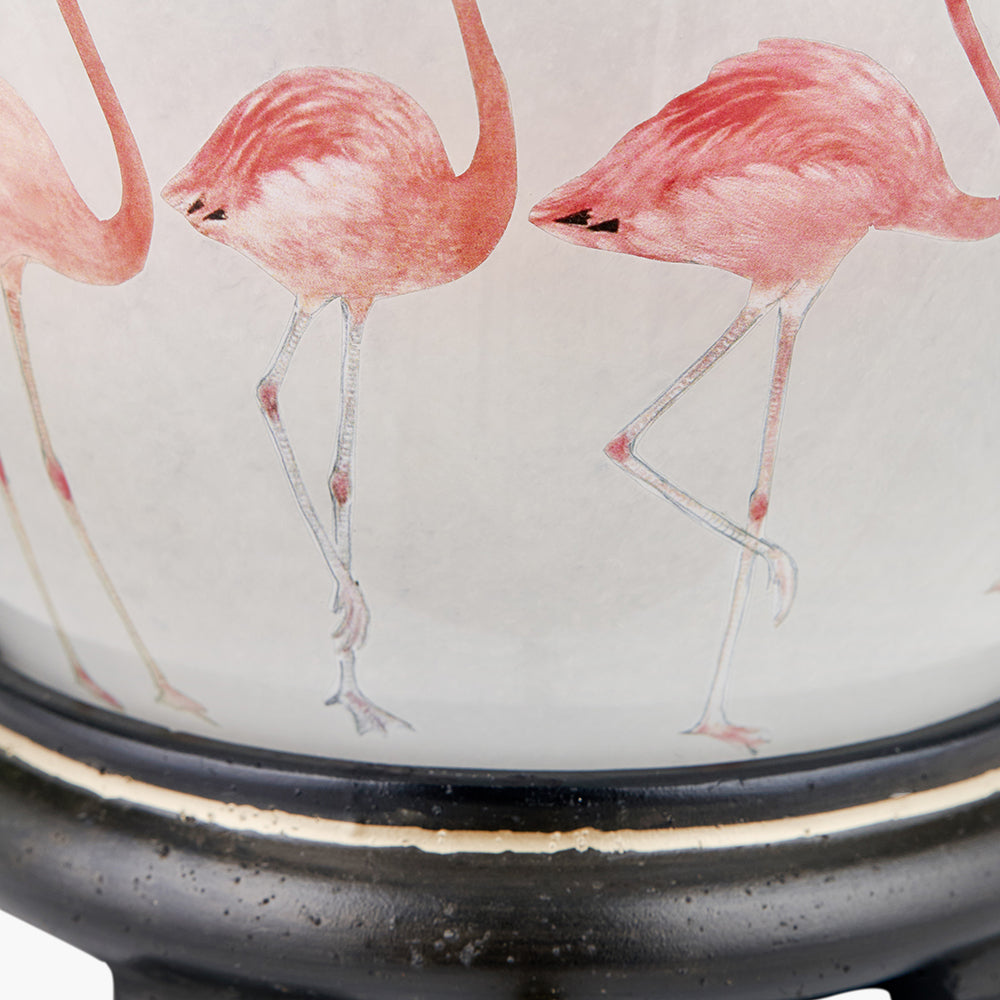 Hand-blown with precision, the lamp showcases a delicate white background adorned with playful, cut-out images of charming pink flamingos. Utilizing the traditional potichomania technique, each flamingo is meticulously crafted to ensure a unique and eye-catching design.