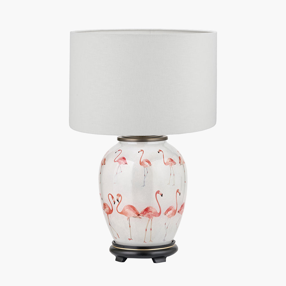 This Jenny Worrall glass table lamp base is internally decorated with skilfully cut-out images of quirky pink flamingos, using the traditional technique of potichomania. The striking flamingos adorn the soft white background to create a showstopping piece which is finished perfectly with a modern white linen cylinder shade. The self-lined open weave lampshade allows the light to filter through the shade, creating a subtle glow.