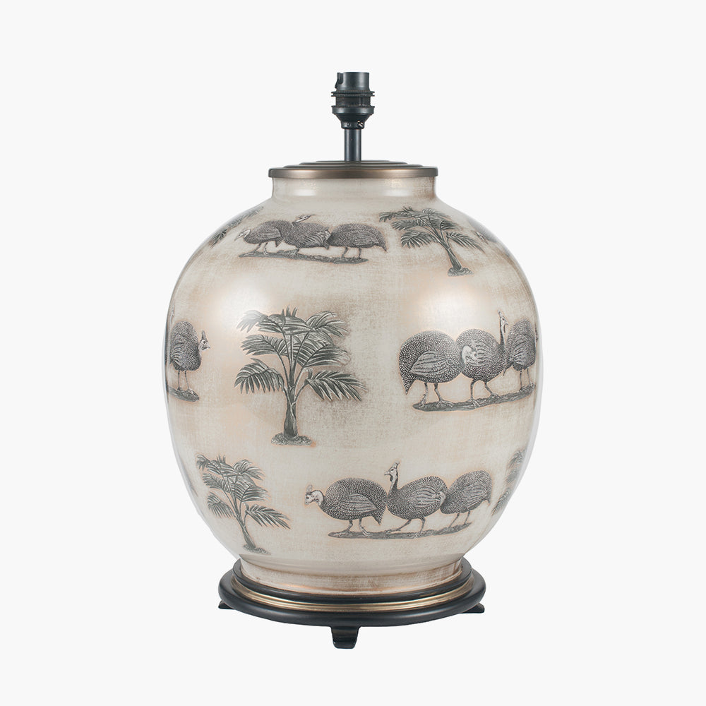 The Guinea Fowl Large Glass Table Lamp Base with Henry 40cm Taupe Handloom Cylinder Lampshade draws on the iconic Jenny Worrall tradition of artisanal lighting. Crafted with the traditional technique of potichomania, delicate decals are applied by hand within the glass base, creating a unique, hand-finished centerpiece.