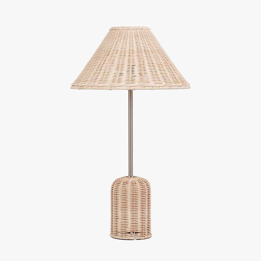 This elegant lamp pairs a natural hand crafted woven rattan base with a rattan tapered shade, adding warm texture and a soft glow to any dark corner. Its compact, balanced design is complemented by the silver metal work making it perfect for hallways, desks, or consoles, bringing subtle sophistication and natural charm to your home.