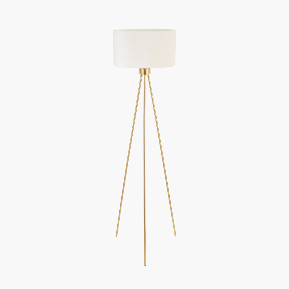 Designed with a stylish brushed brass finish, this floor lamp features slim, sturdy legs that provide both stability and sophistication. The luxurious cream velvet shade, lined with matching faux cotton, exudes an aura of glamour, enhancing the ambiance of any room.