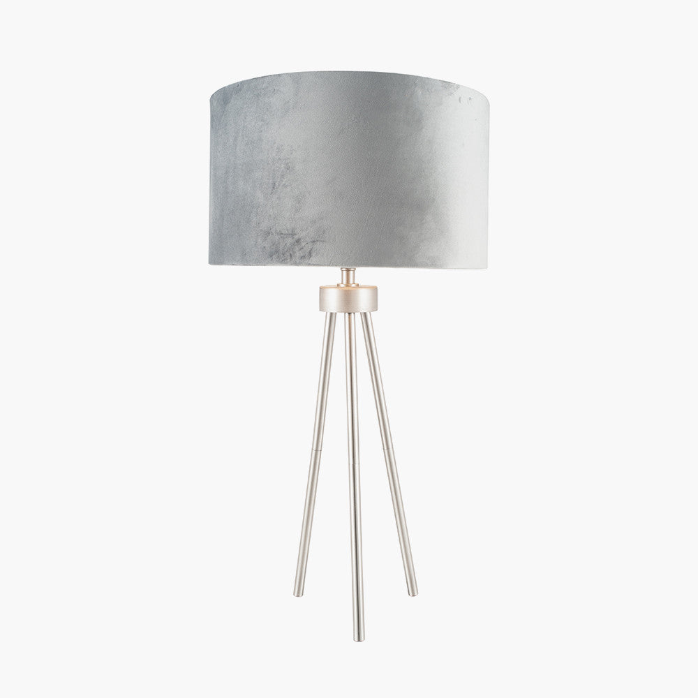 This contemporary tripod table lamp is a simple yet elegant style with slim legs and a brushed silver finish. The shade is a luxurious grey velvet lined in matching faux cotton adding sophisticated glamour to any room. Also available; a matching floor lamp and a matt black colourway.