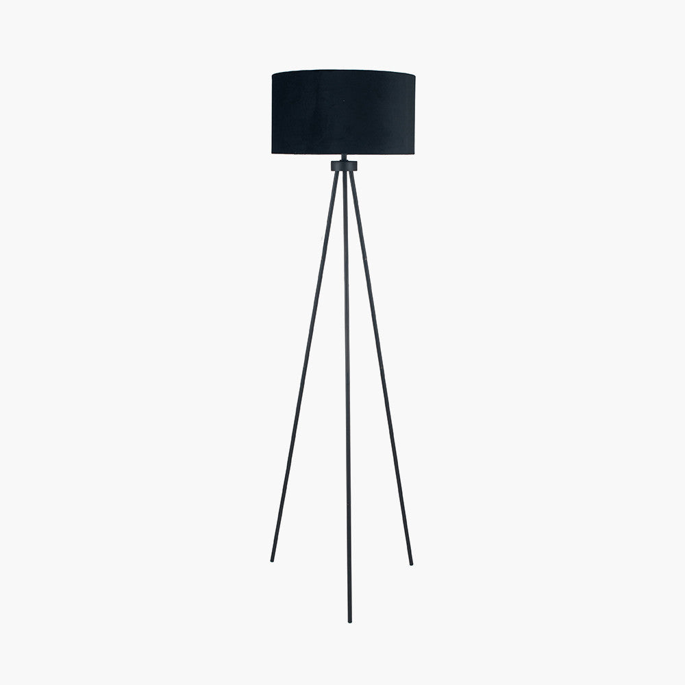 This contemporary tripod floor lamp is a simple yet elegant style with slim legs and matt black metal finish. The shade is a luxurious black velvet lined in matching faux cotton adding sophisticated glamour to any room. Also available; a matching table lamp and a brushed silver colourway.