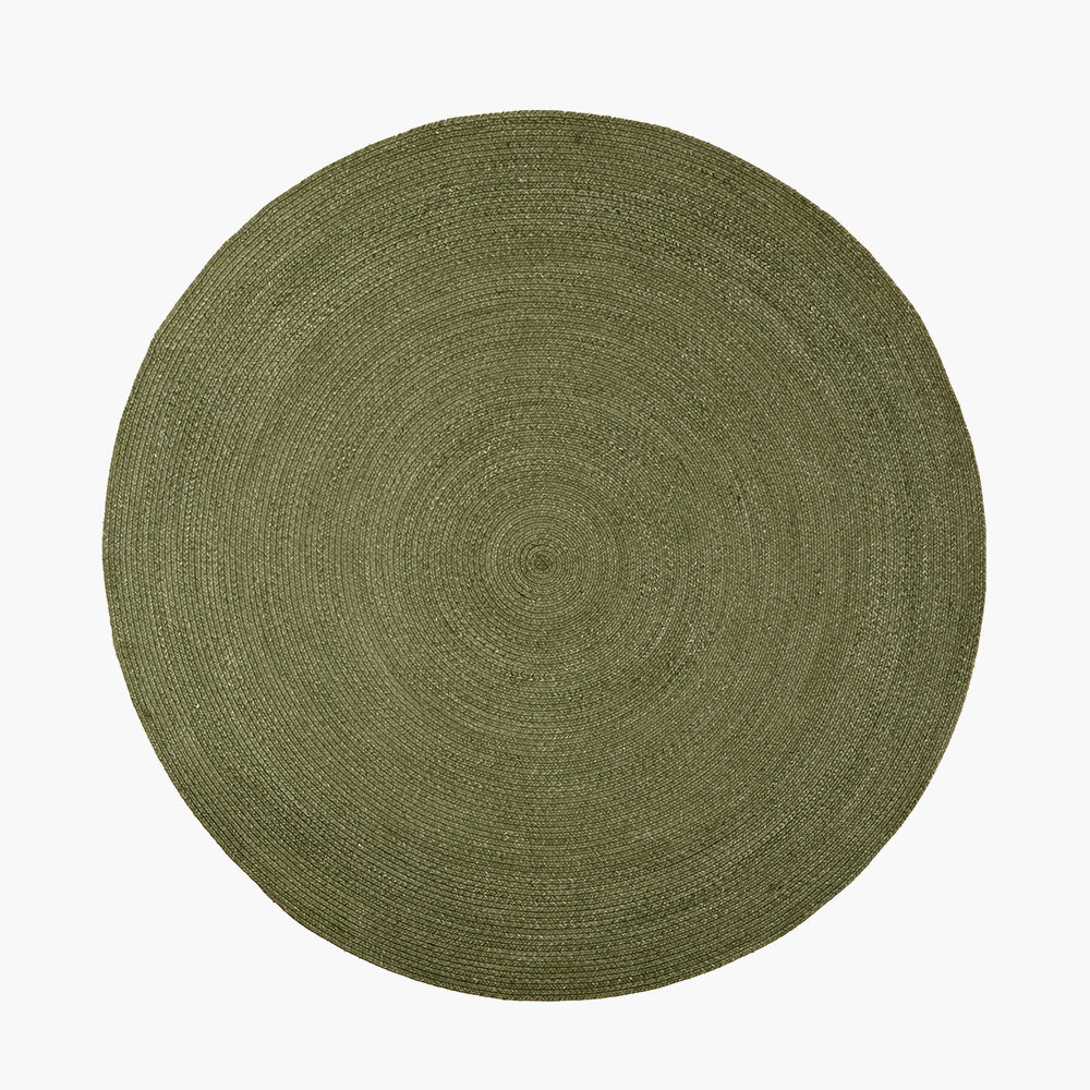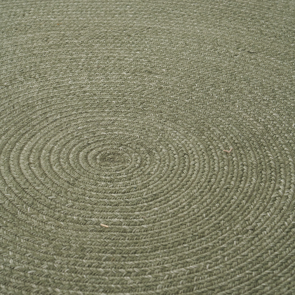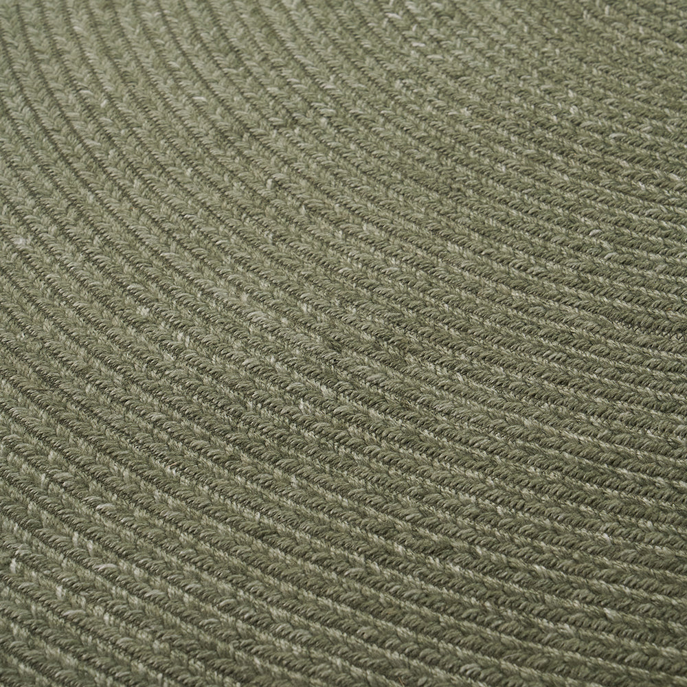 The circular silhouette in a soft sage green with a tweed-inspired texture adds a subtle, timeless style to patios, balconies, sunrooms, or entryways.