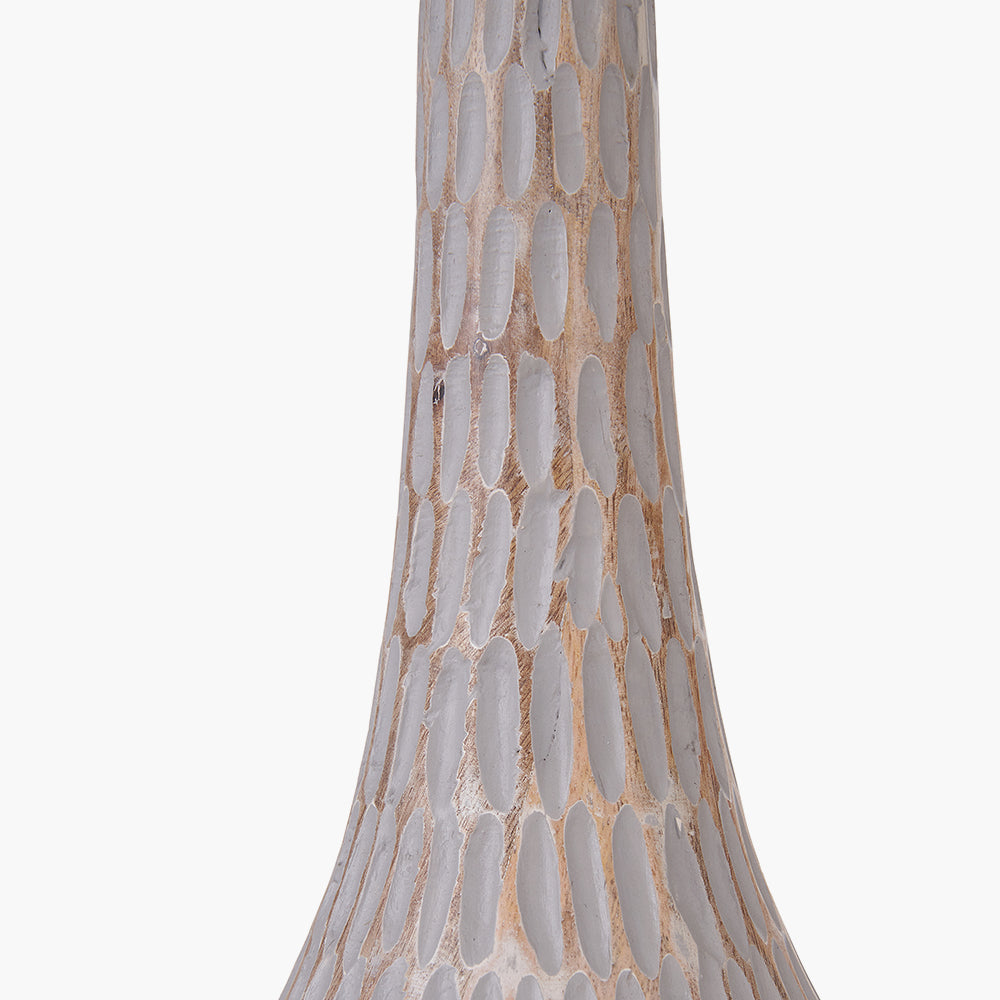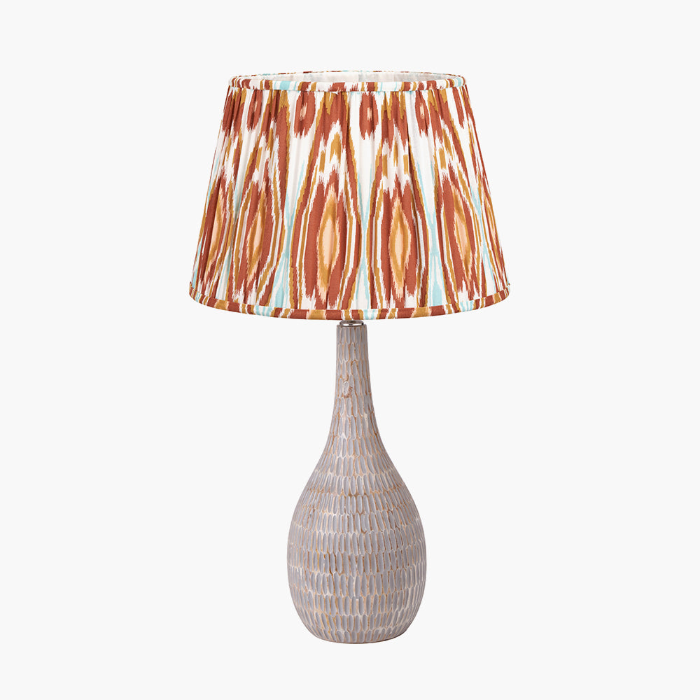 Ioan Grey Engraved Wood Bottle Table Lamp Base with Izara 40cm Cinnamon Ikat Patterned Mushroom Pleat Tapered Lampshade offers a refined, minimalist touch for any room. The bottle-shaped base features a grey wash finish with etched marks for subtle texture, creating a versatile centerpiece that pairs with a range of decors.